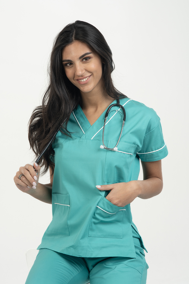 VenditaScegli Questo prodotto ha più varianti. Le opzioni possono essere scelte nella pagina del prodottoCasacca unisex collo V incrocio verde acqua e profili bianchi