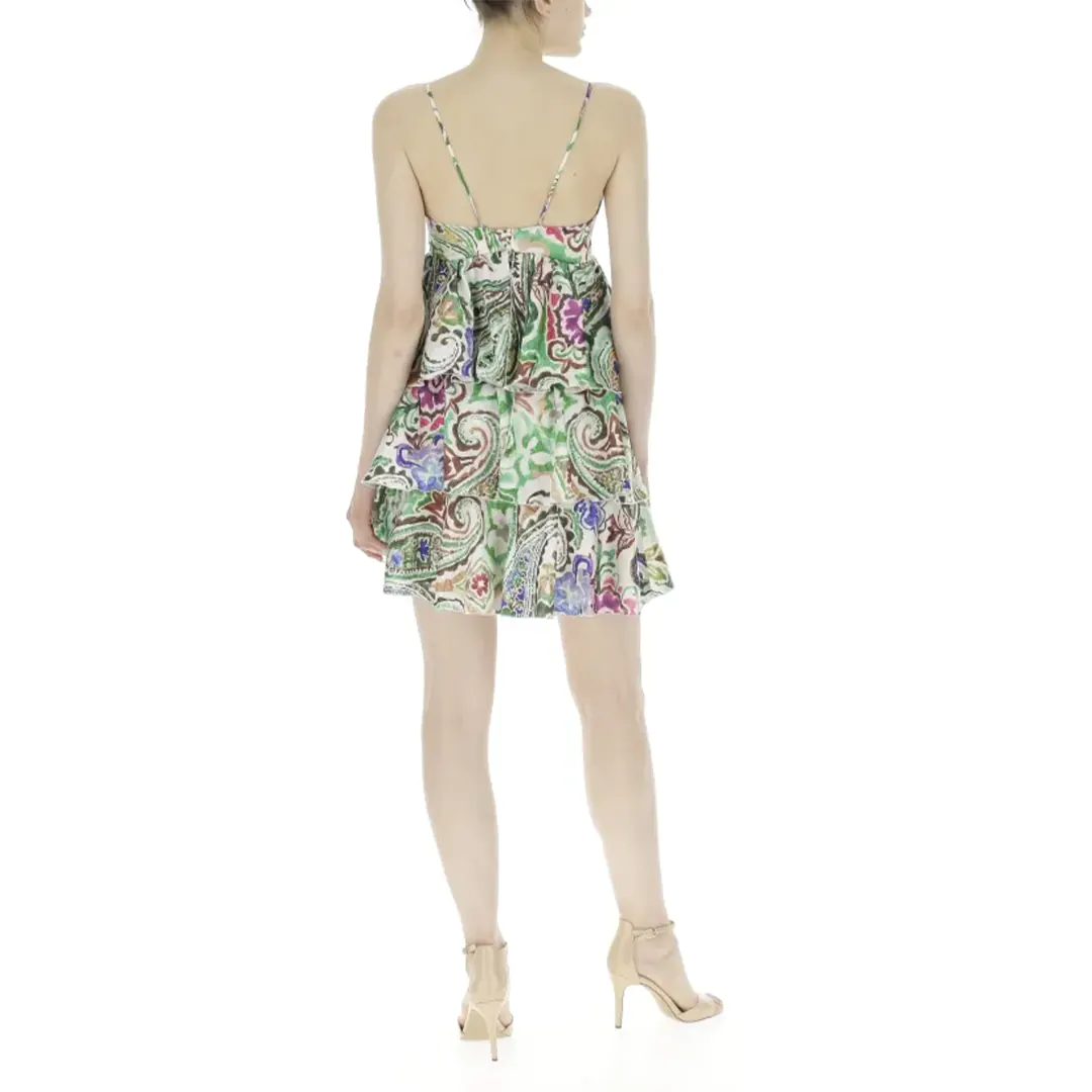 VICOLO ABITO DONNA Abito con balze in fantasia astratta, spalline sottili e scollo a v frontale, chiusura con zip nascosta sul retro Tessuto: 100% poliestere