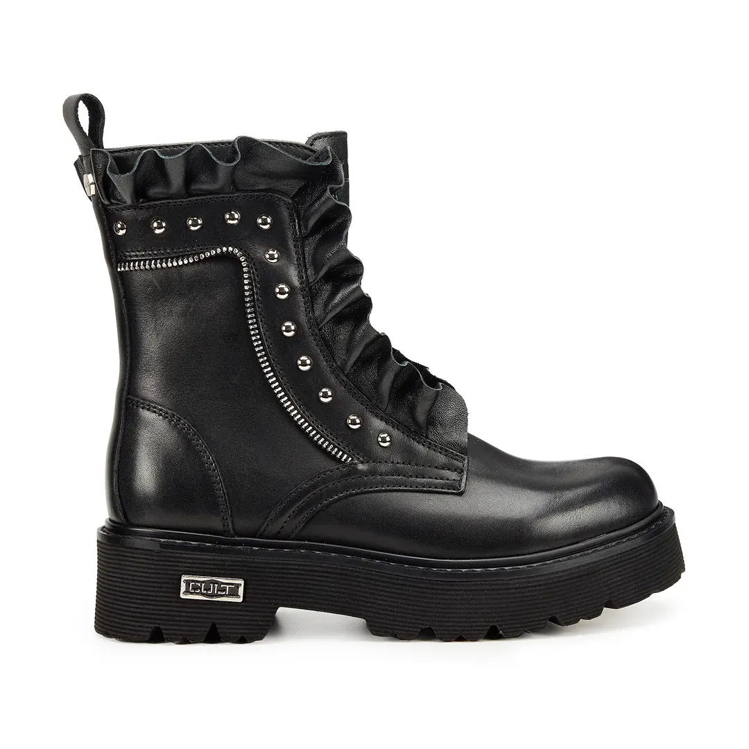 Essenziali e speciali allo stesso tempo, gli anfibi proposti da Cult diventeranno una certezza del vostro guardaroba. La tomaia è in liscia pelle nera decorata da iconiche rouches, zip e borchie sferiche per dare una sfumatura decisa ad abiti monocromatici come a pantaloni cropped.