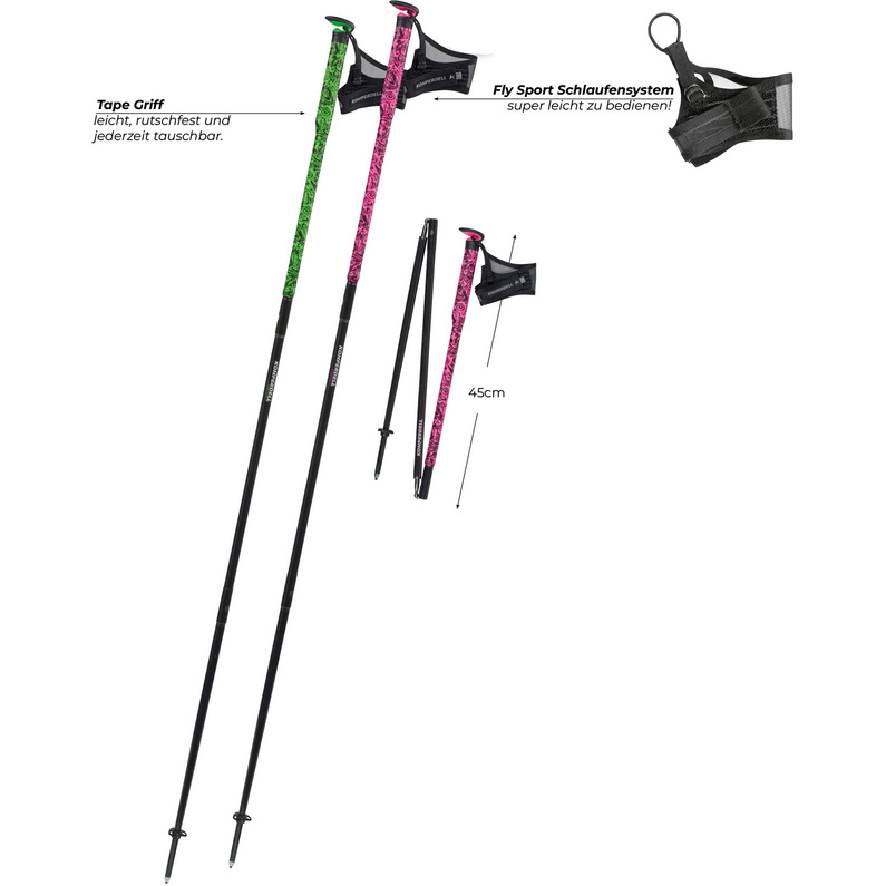 La struttura a 3 sezioni in carbonio ultraleggero da 14mm offre rigidità eccezionale e trasmissione ottimale della potenza. L’impugnatura Trail Pro Tape Griff sottile garantisce controllo diretto e precisione, mentre i nastri antiscivolo intercambiabili assicurano presa perfetta in ogni condizione. Il cinturino Fly Sport favorisce maneggevolezza e massima trasmissione della potenza, con possibilità di upgrade al cinturino Fly Loop disponibile separatamente. Incluso 1 paio di nastri di ricambio per durabilità estesa.