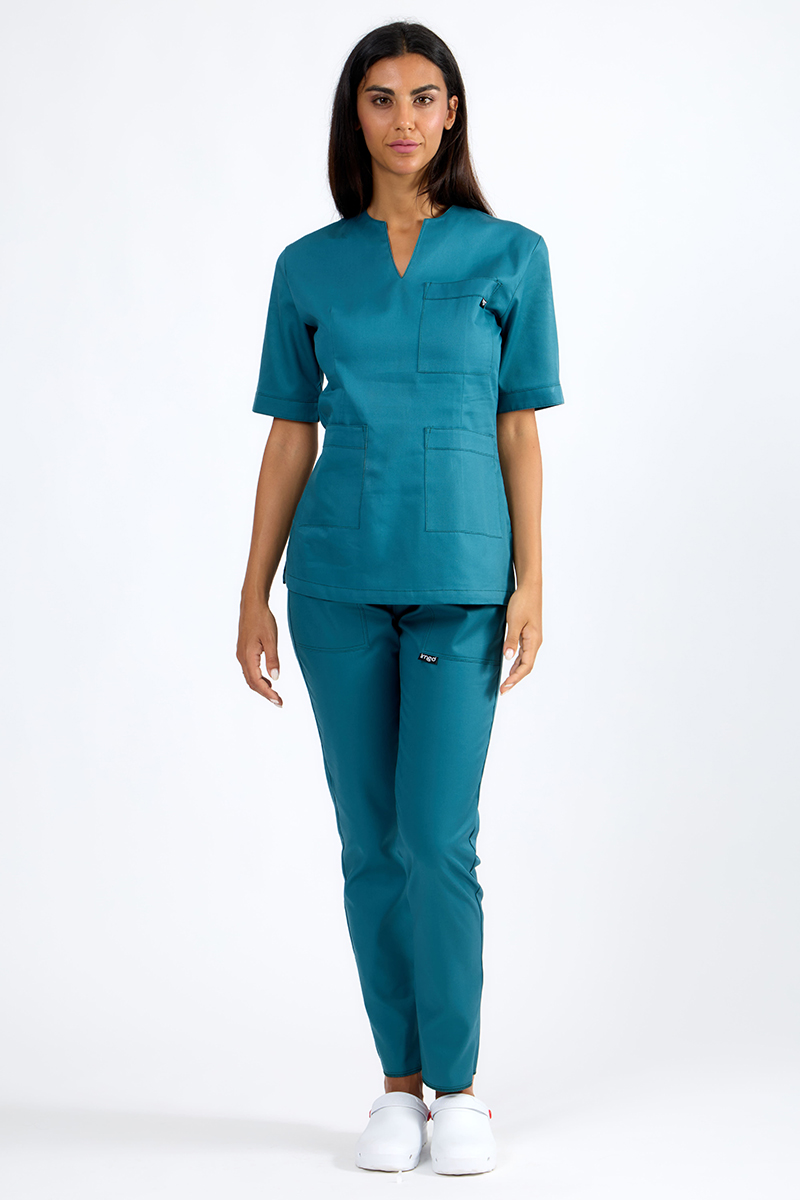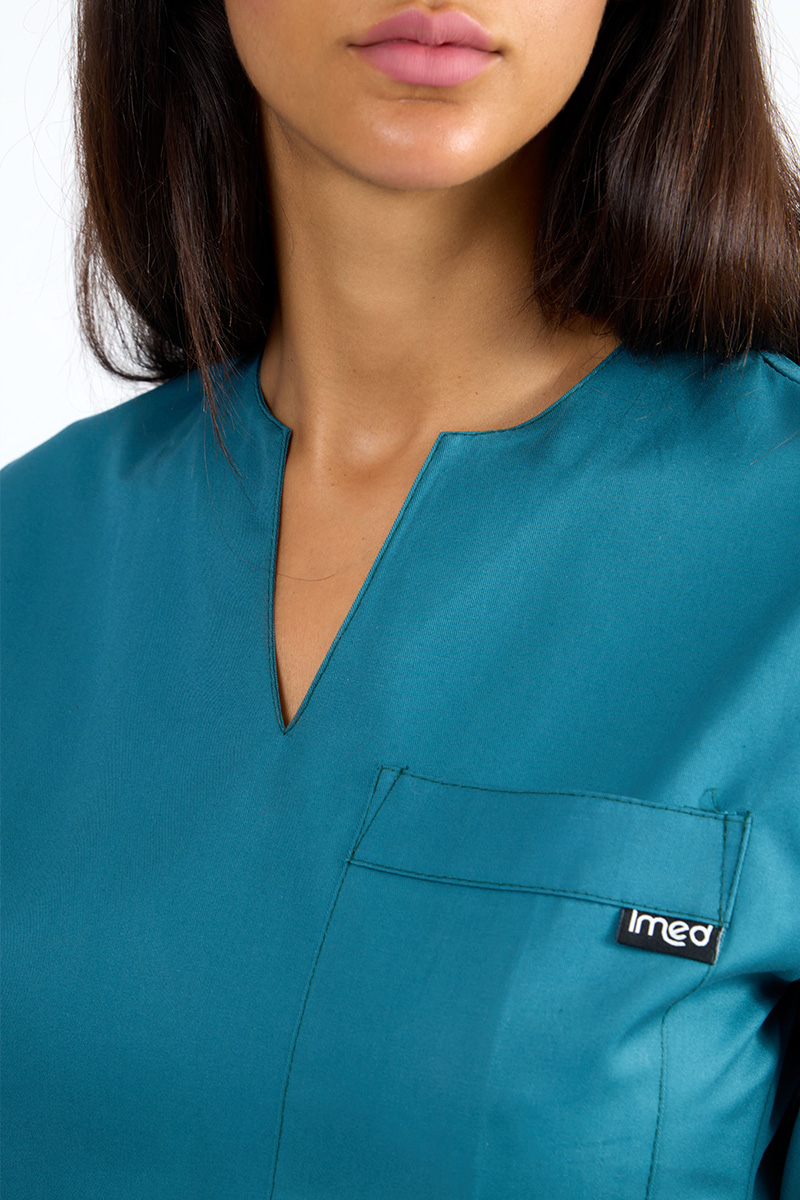 Dotata di due pratiche tasche anteriori e un taschino aggiuntivo, questa casacca unisce stile e funzionalità, rendendola perfetta per ambienti professionali come studi medici, centri estetici o per l’uso quotidiano.