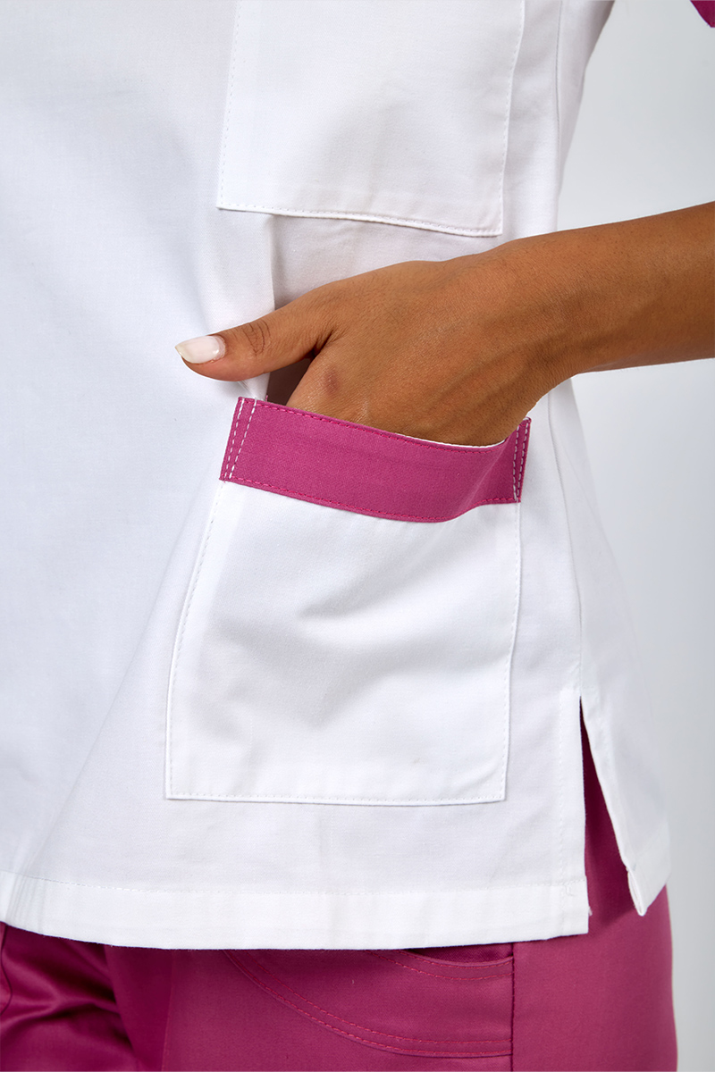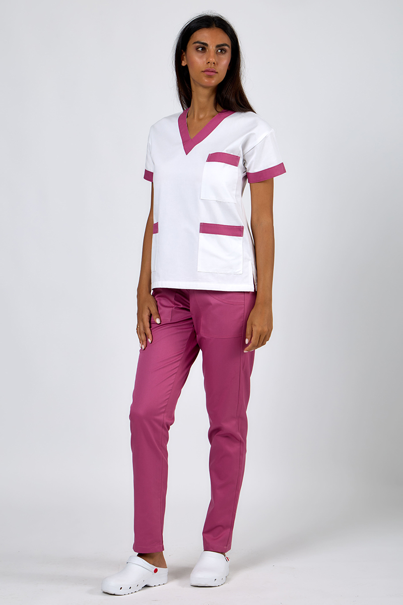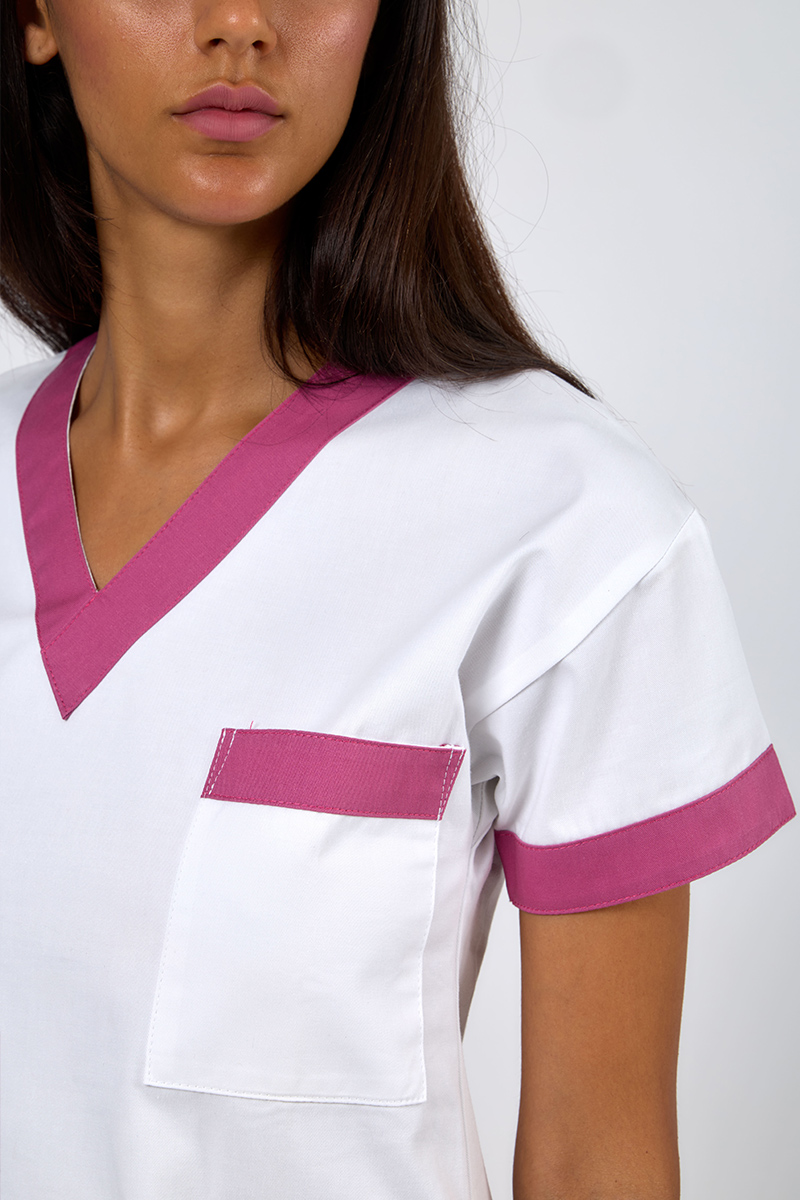 Casacca donna con collo a V e manica a kimono, realizzata in cotone al 100%, con bordi fucsia per un design confortevole e leggero, la rende ideale per l’uso quotidiano in ambito professionale. La manica a kimono aggiunge libertà di movimento e uno stile distintivo, mentre il tessuto naturale garantisce traspirabilità e freschezza.