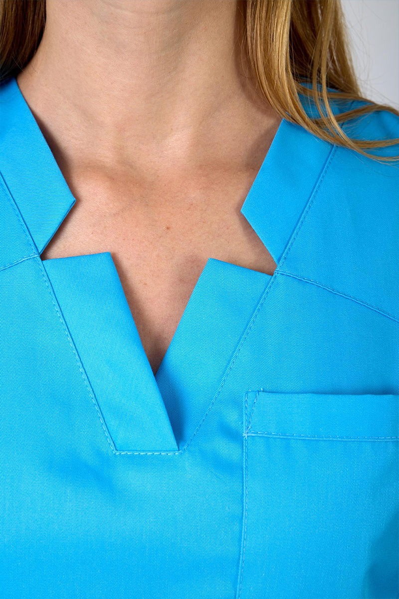 Casacca donna con scollo a V doppio e maniche a giro, in misto 65% poliestere e 35% cotone nel colore atollo con 2 tasche e taschino e con spacchetti laterali con una linea sinuosa che enfatizza la figura femminile.