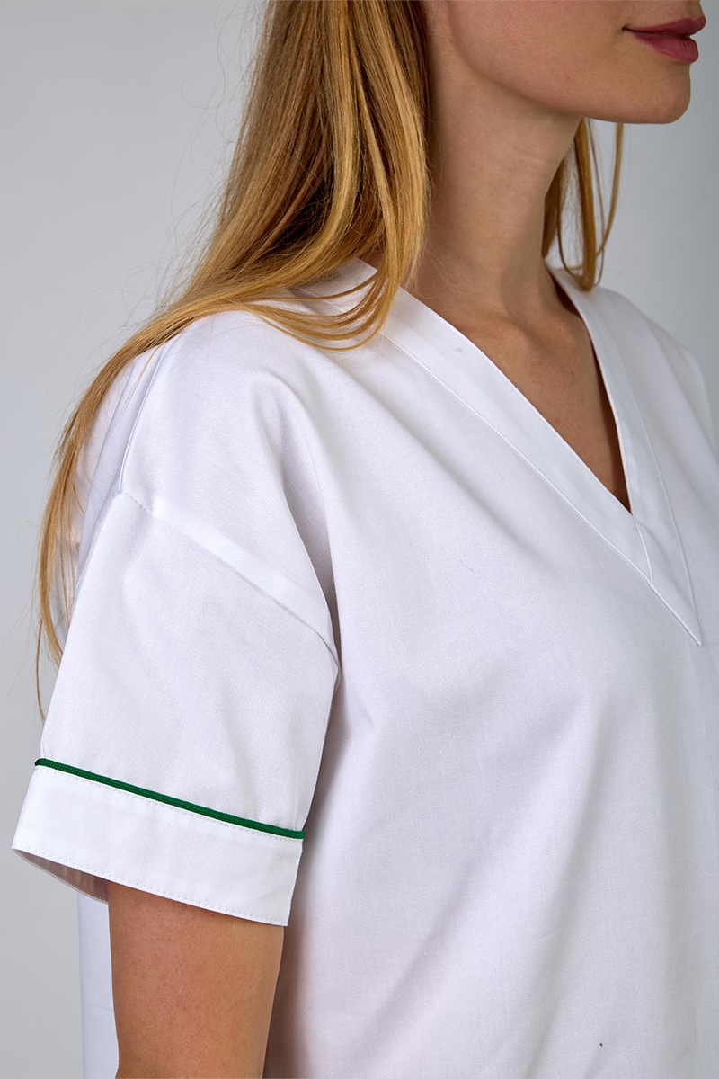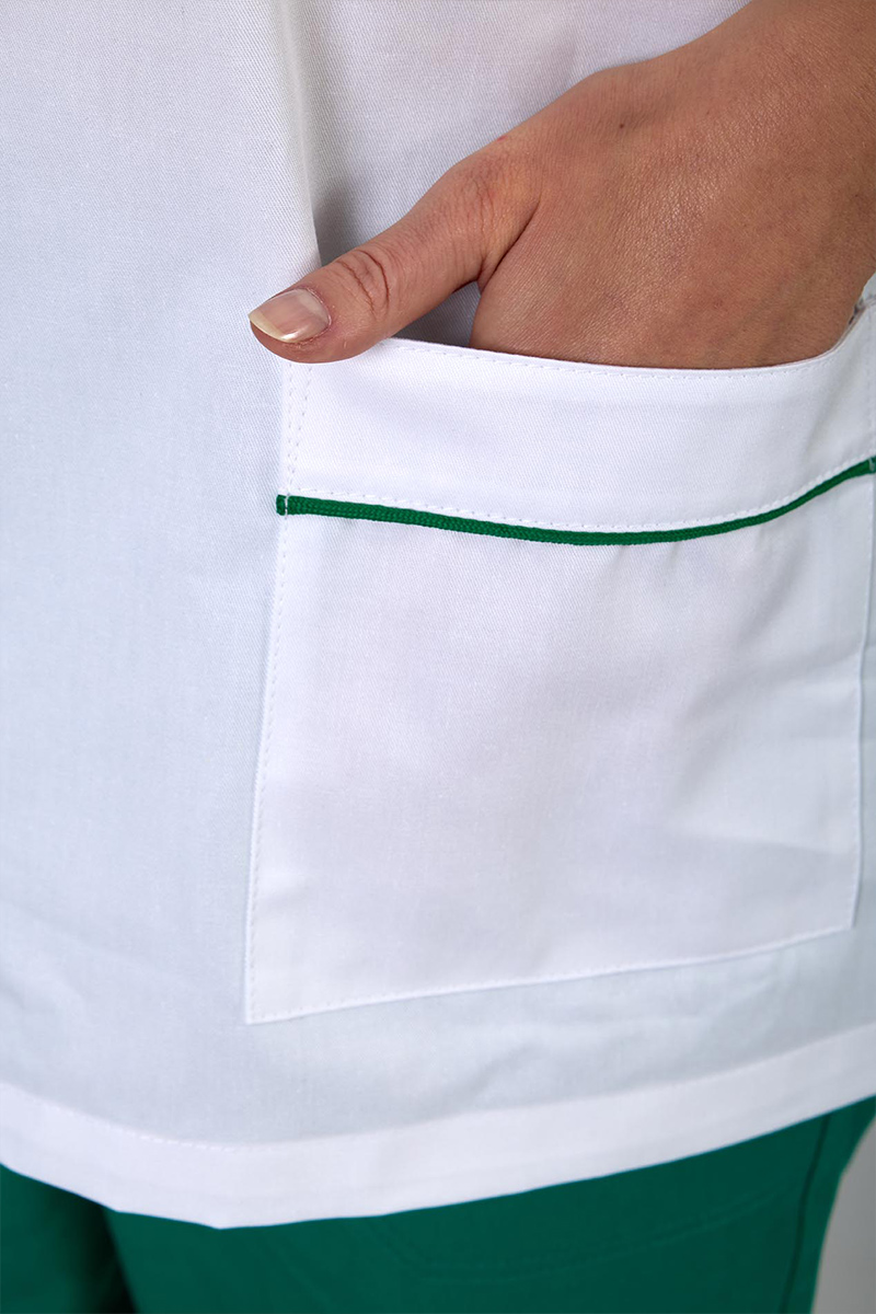 Elemento distintivo in questa versione color bianco sono i profili coda di topo, di colore verde: questa combinazione di colore accentua le linee del capo creando un raffinato contrasto e aggiungendo un tocco di personalità, un capo perfetto per chi cerca stile e professionalità in un’unica soluzione.