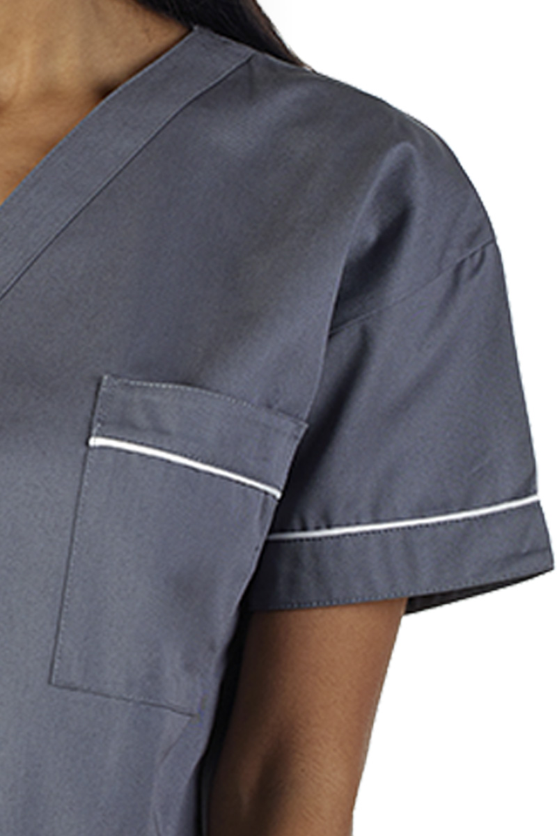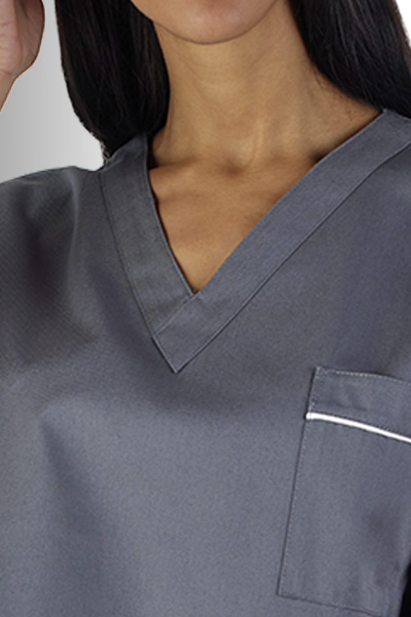 Elemento caratterizzante di questa versione colore grigio scuro sono i profili coda di topo bianchi: questa combinazione cromatica evidenzia le linee del capo creando un contrasto elegante e aggiungendo un tocco di originalità, rendendolo ideale per chi desidera raffinatezza e professionalità in un’unica proposta.
