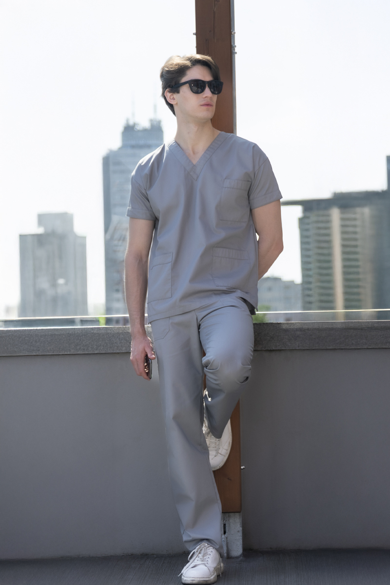 Casacca unisex con scollo a V e maniche a kimono, in 100% cotone nel delicato colore grigio con 2 tasche e taschino.