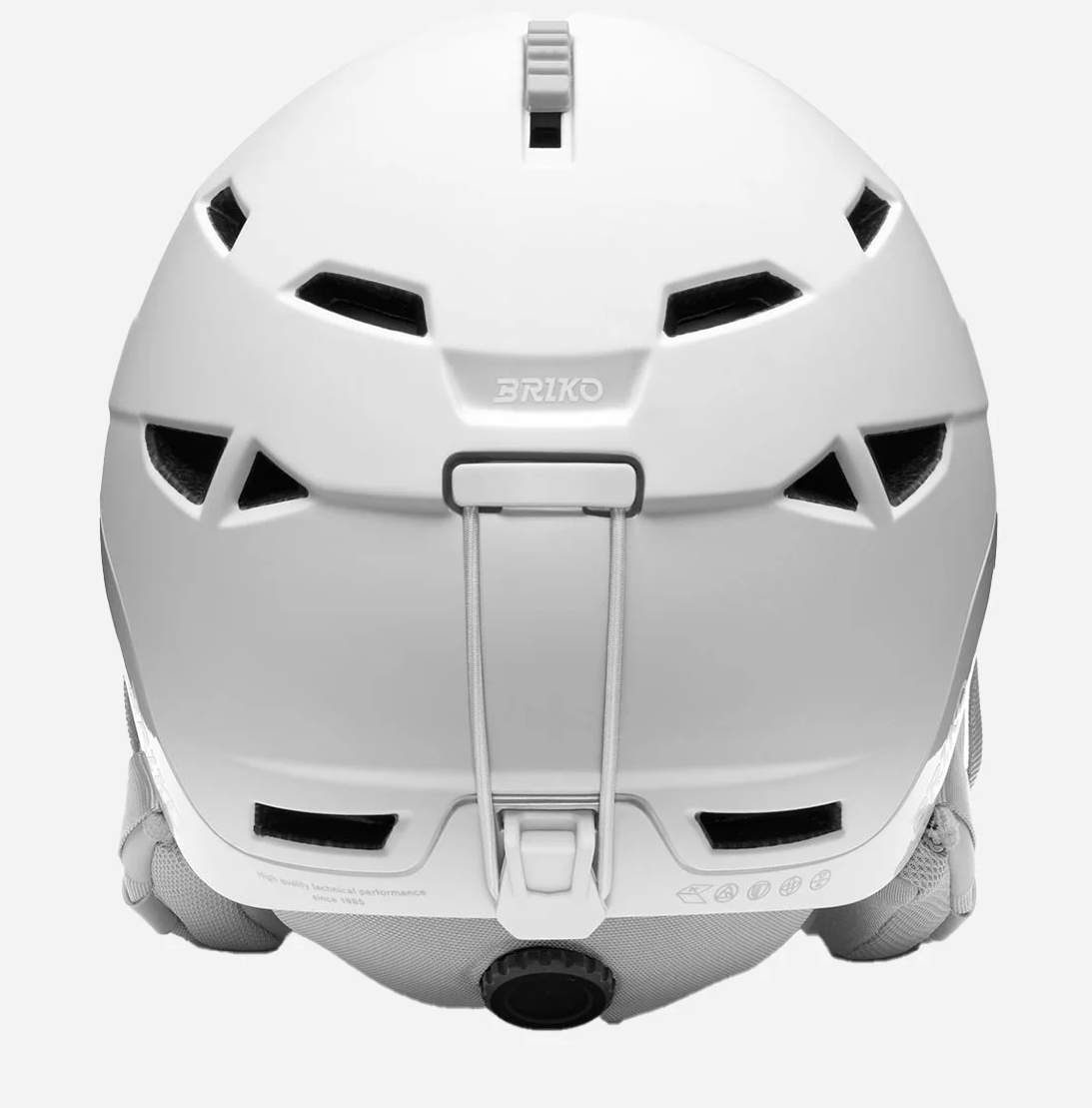 Casco sci donna Briko Elli W bianco con calotta in policarbonato, imbottiture in fibra di bamboo lavabili e sistema Slim Rollfit. Paraorecchie removibili in nylon riciclato.