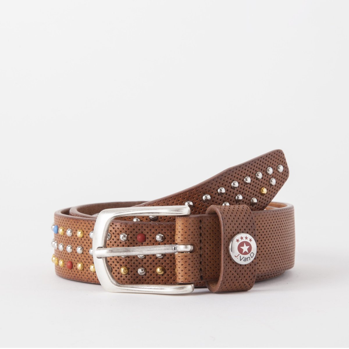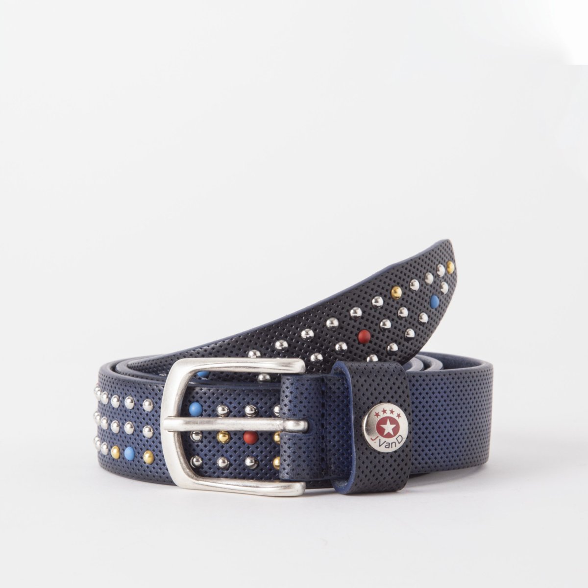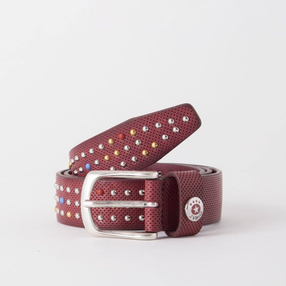 Cintura in vera pelle con borchie disponibile nei colori blu, rosso e cuoio.