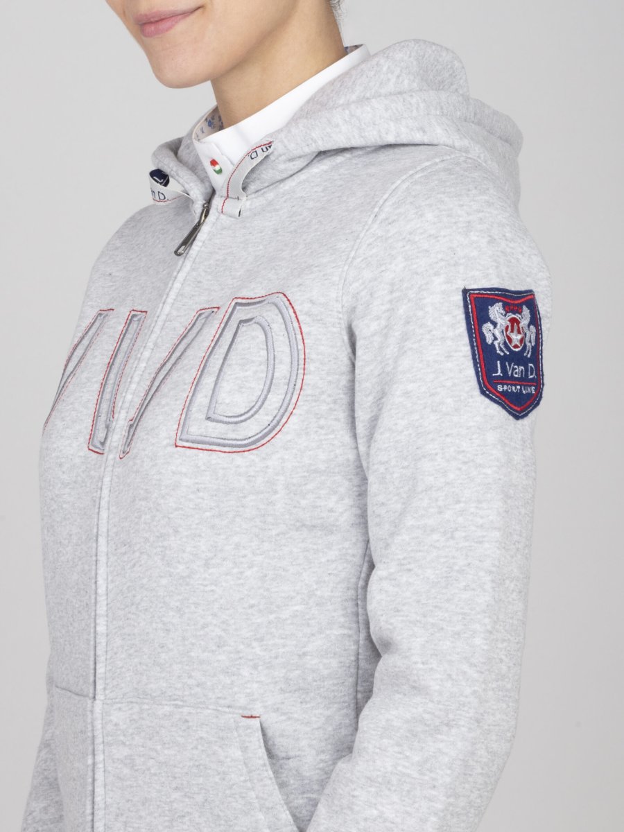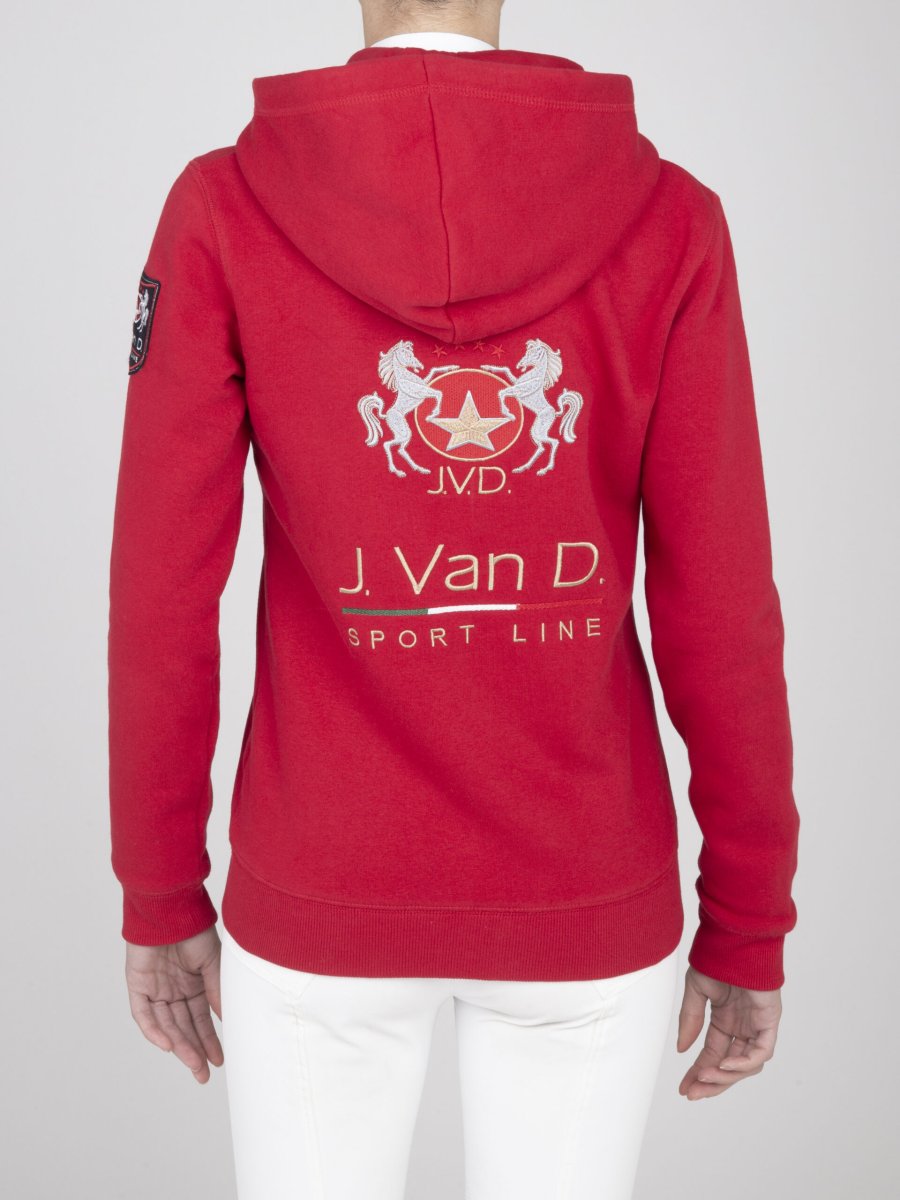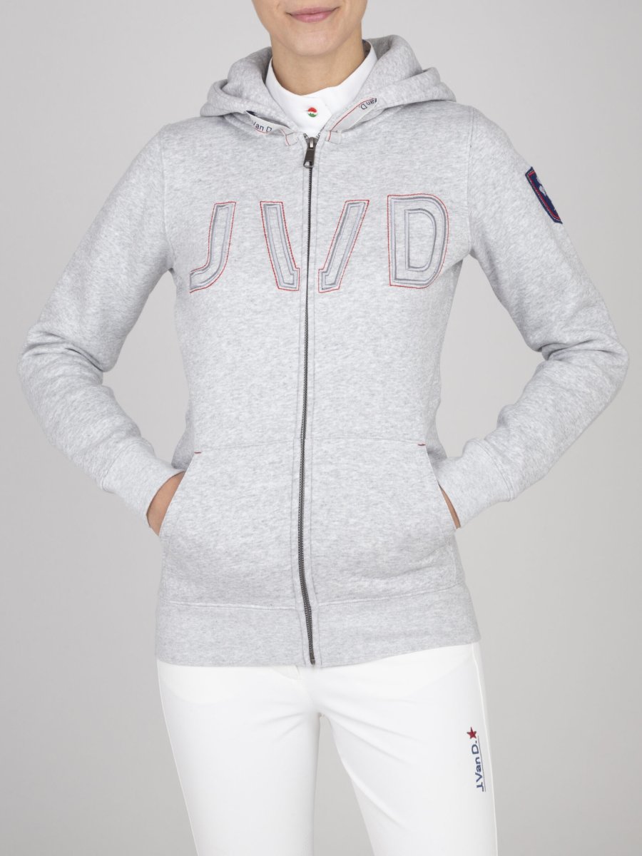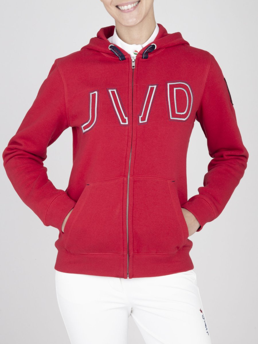 Felpa da donna con cappuccio, ricamo JVD sul petto. Disponibile nei colori grigio, rosso, blu, blu royal.
