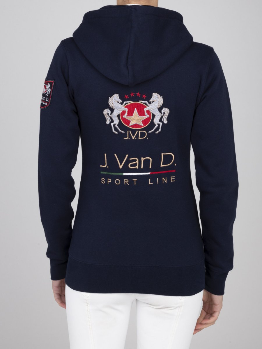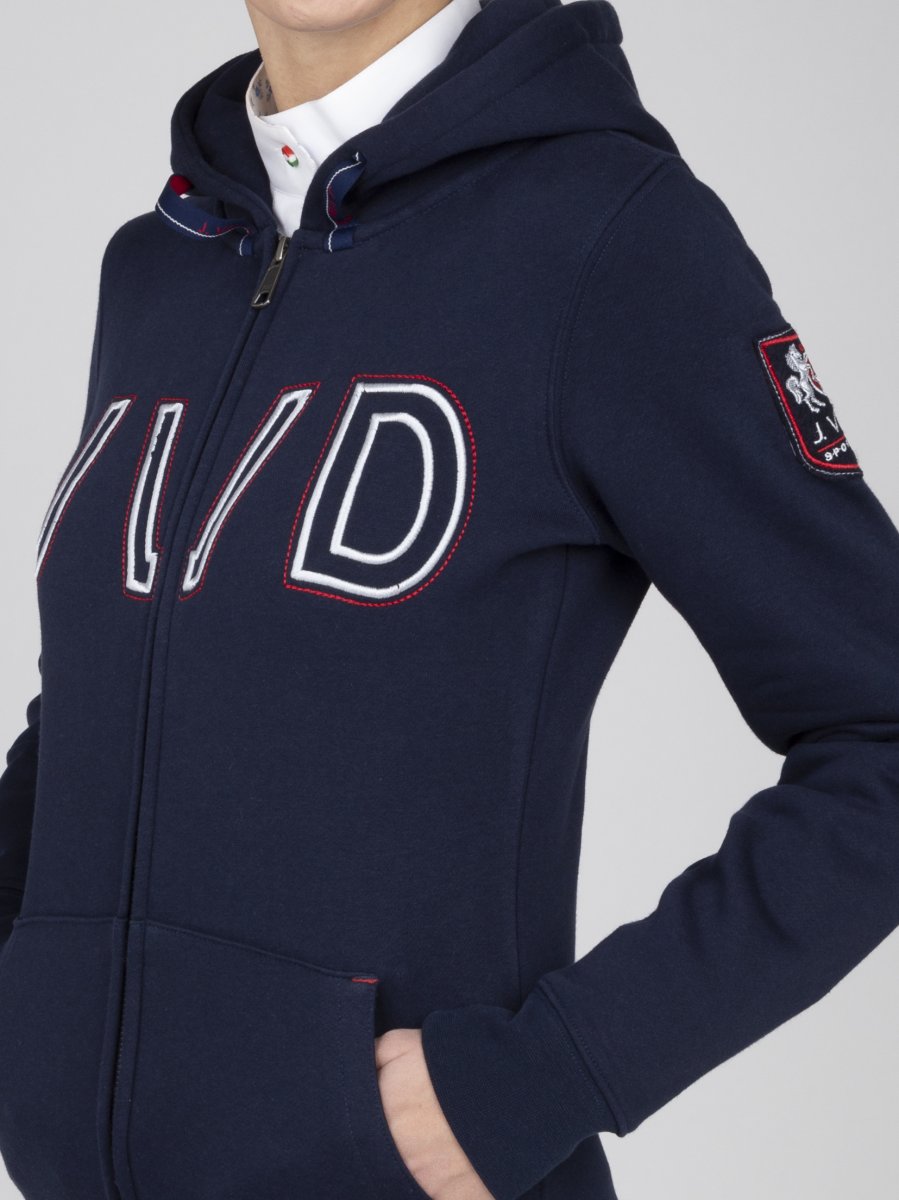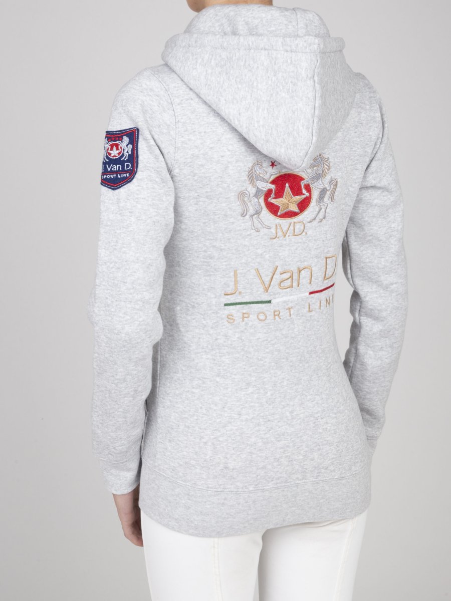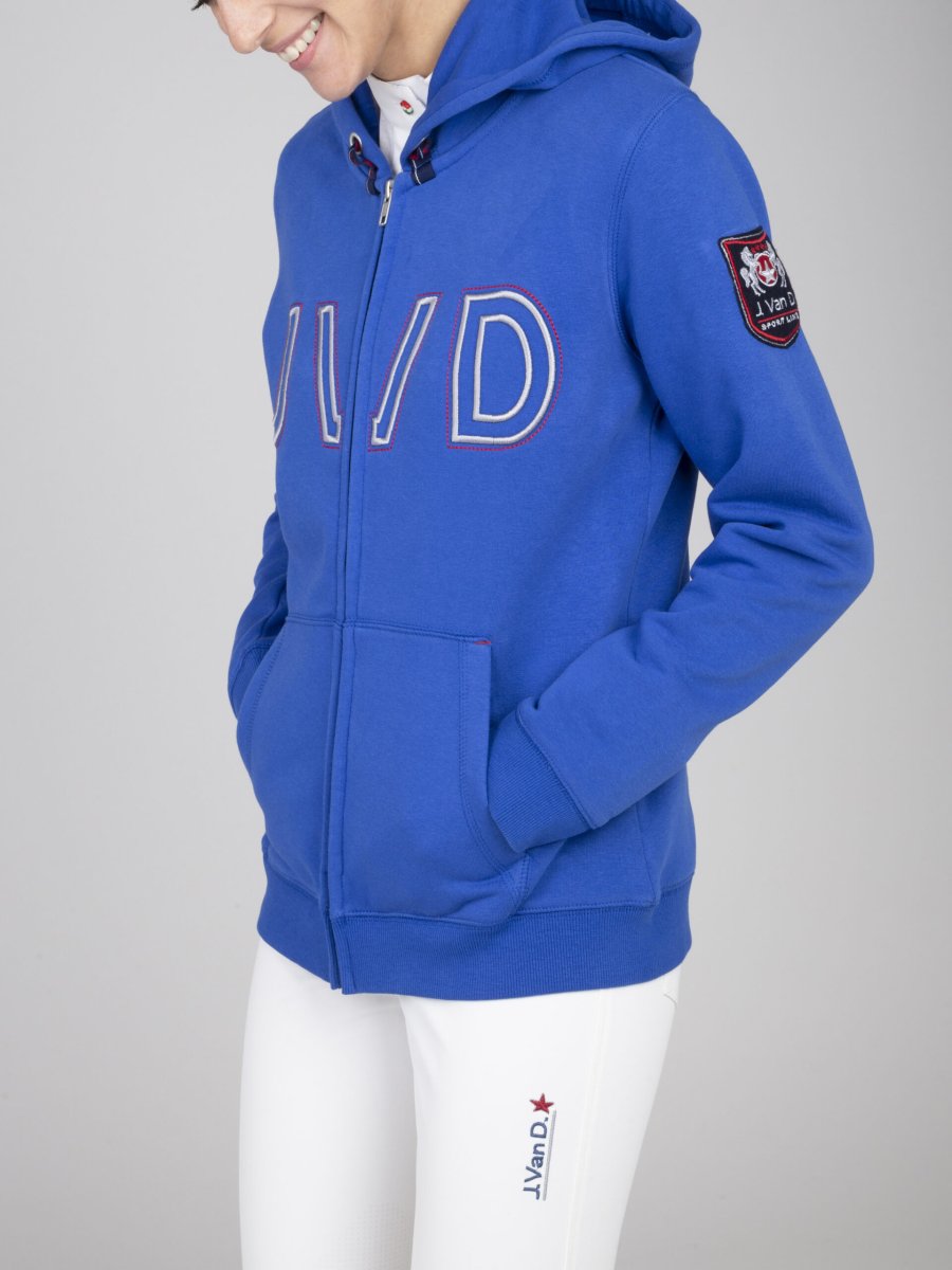 Felpa da donna con cappuccio, ricamo JVD sul petto. Disponibile nei colori grigio, rosso, blu, blu royal.