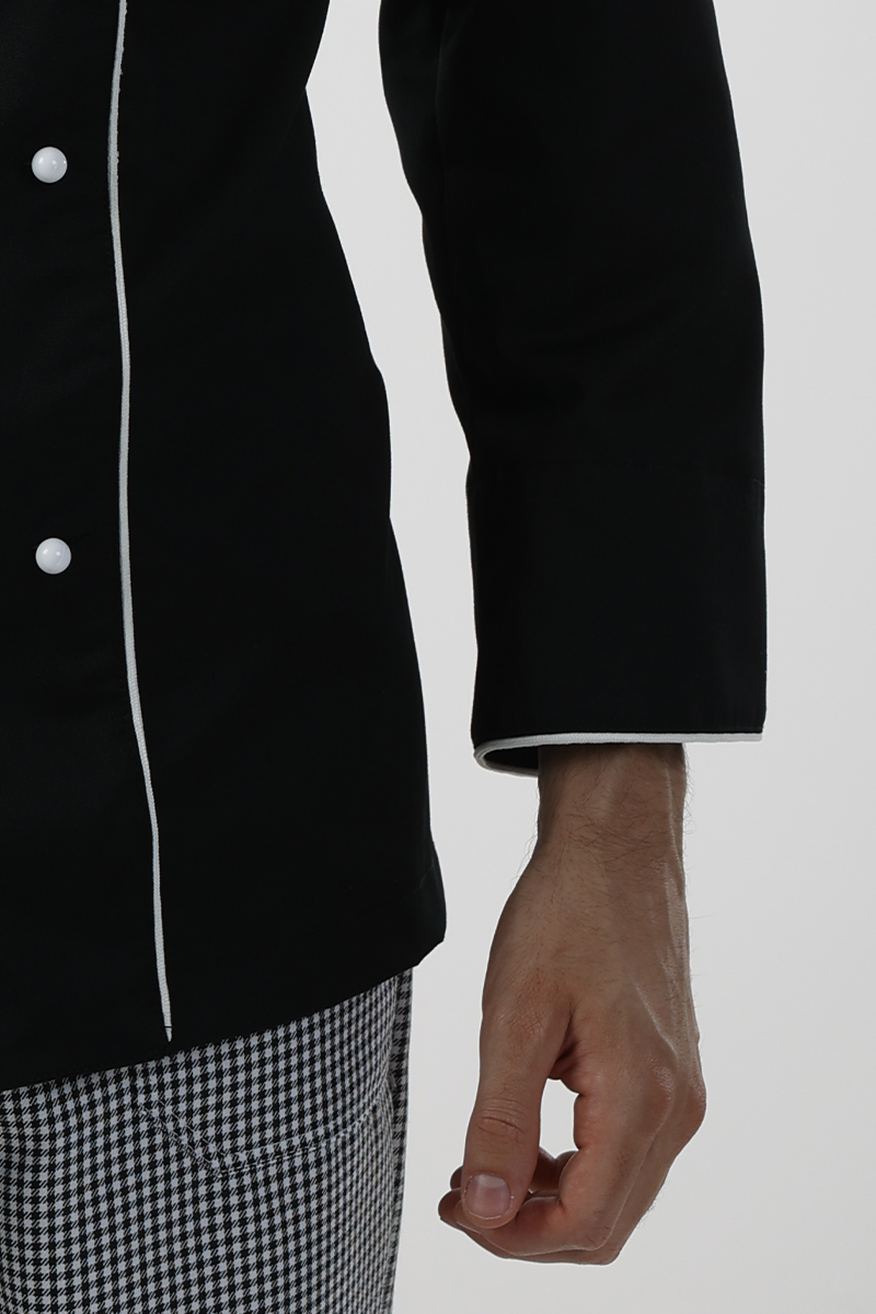 Giacca chef unisex nera, doppiopetto, manica a giro lunga, collo alla coreana, realizzata in misto 65% poliestere-35% cotone. Profili coda di topo bianchi su collo, manica e sul doppiopetto.