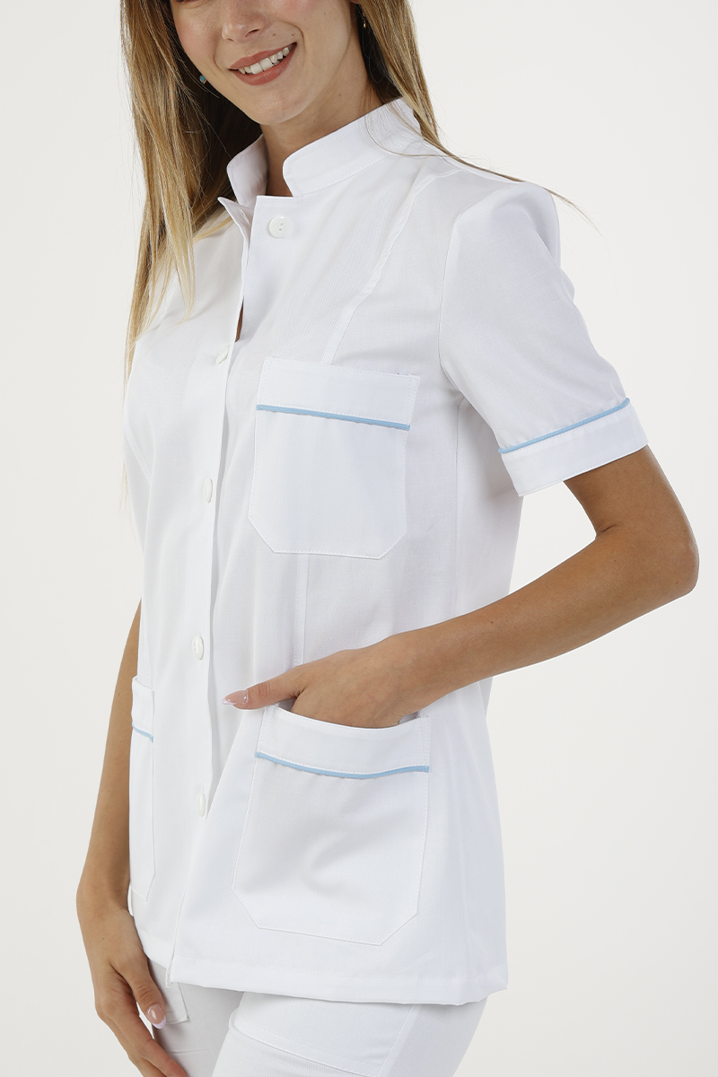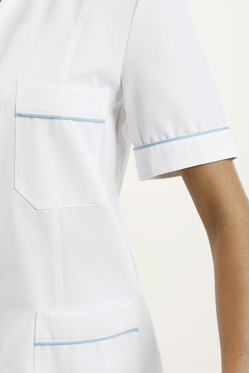 La versione in bianco con delicati profili coda di topo azzurri su collo, maniche, tasca e taschino dona freschezza e professionalità, rendendo la giacca adatta a diversi reparti sanitari e facile da abbinare ai pantaloni da lavoro coordinati.