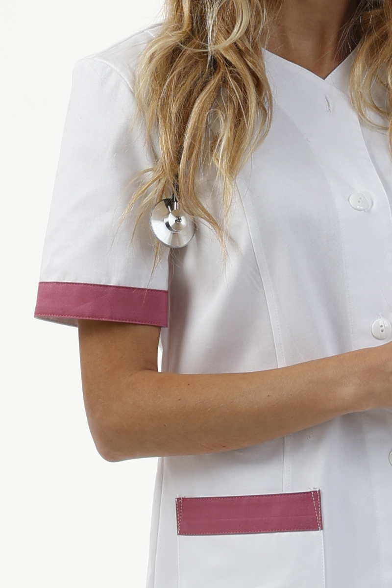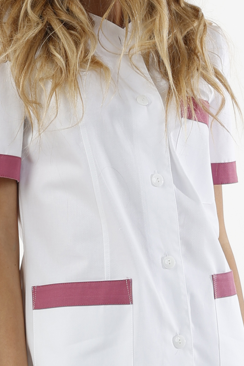 Il modello è arricchito da bordi color fucsia su maniche, tasche e taschini, un dettaglio che dona freschezza e un tocco distintivo, ideale per differenziare la propria uniforme con eleganza e semplicità. Le tasche capienti e i taschini pratici rendono la giacca funzionale e perfetta per riporre strumenti e piccoli accessori da lavoro.