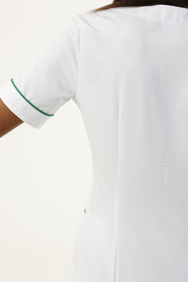 Le maniche a giro garantiscono libertà di movimento e una vestibilità sempre confortevole, ideale per chi trascorre molte ore in attività. I profili coda di topo in verde, presenti sulle maniche, donano un dettaglio moderno e distintivo che rende la giacca più elegante e personalizzata rispetto alle divise tradizionali.