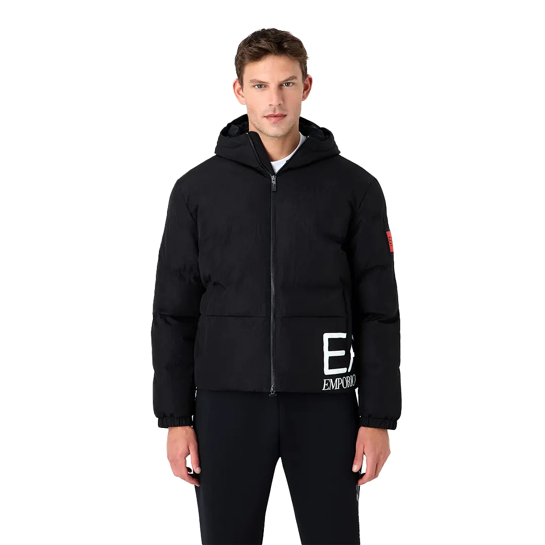 GIACCA BOMBER IMBOTTITO EA7 Giacca imbottita con cappuccio e maxi logo Composizione 100% Poliammide Vestibilità over Cappuccio fisso Chiusura frontale con zip Maxi logo EA7 a contrasto sul fianco sinistro Due tasche laterali a filetto Dettaglio patch a contrasto sulla manica sinistra Coulisse al fondo