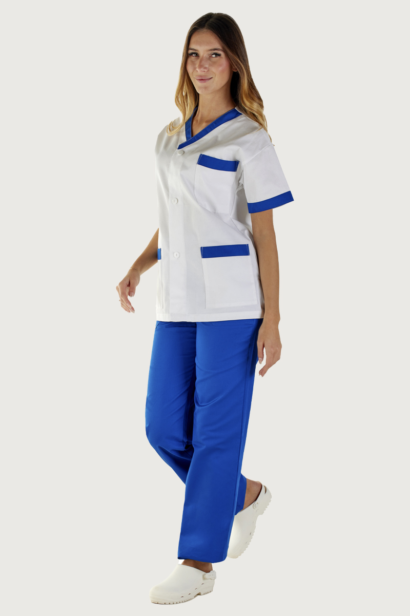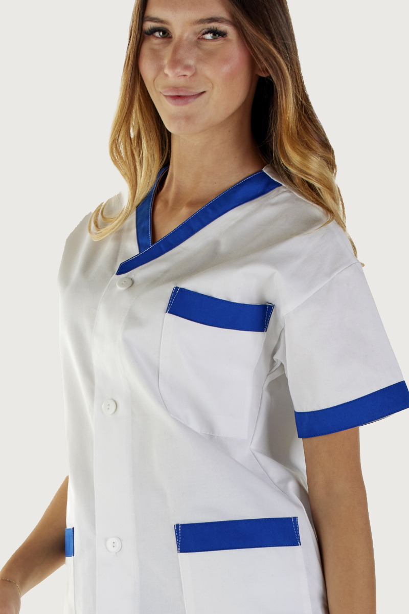 Le maniche a kimono assicurano ampia libertà di movimento, rendendo la giacca ideale per medici, infermieri e operatori che necessitano di comodità senza rinunciare allo stile. I bordi alti in colore bluette su collo, tasche e taschino aggiungono un dettaglio distintivo, valorizzando il capo e differenziandolo dalle divise tradizionali.