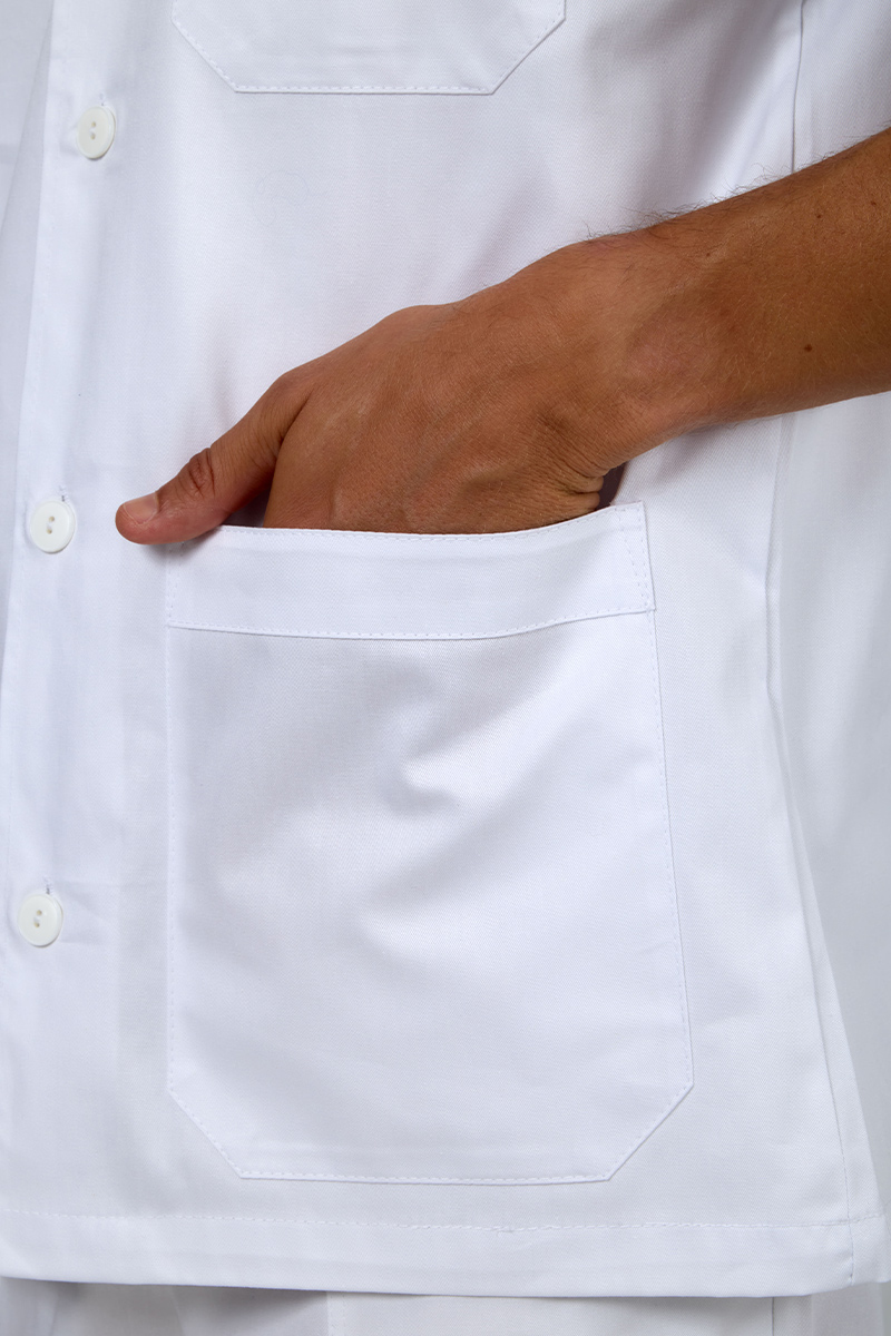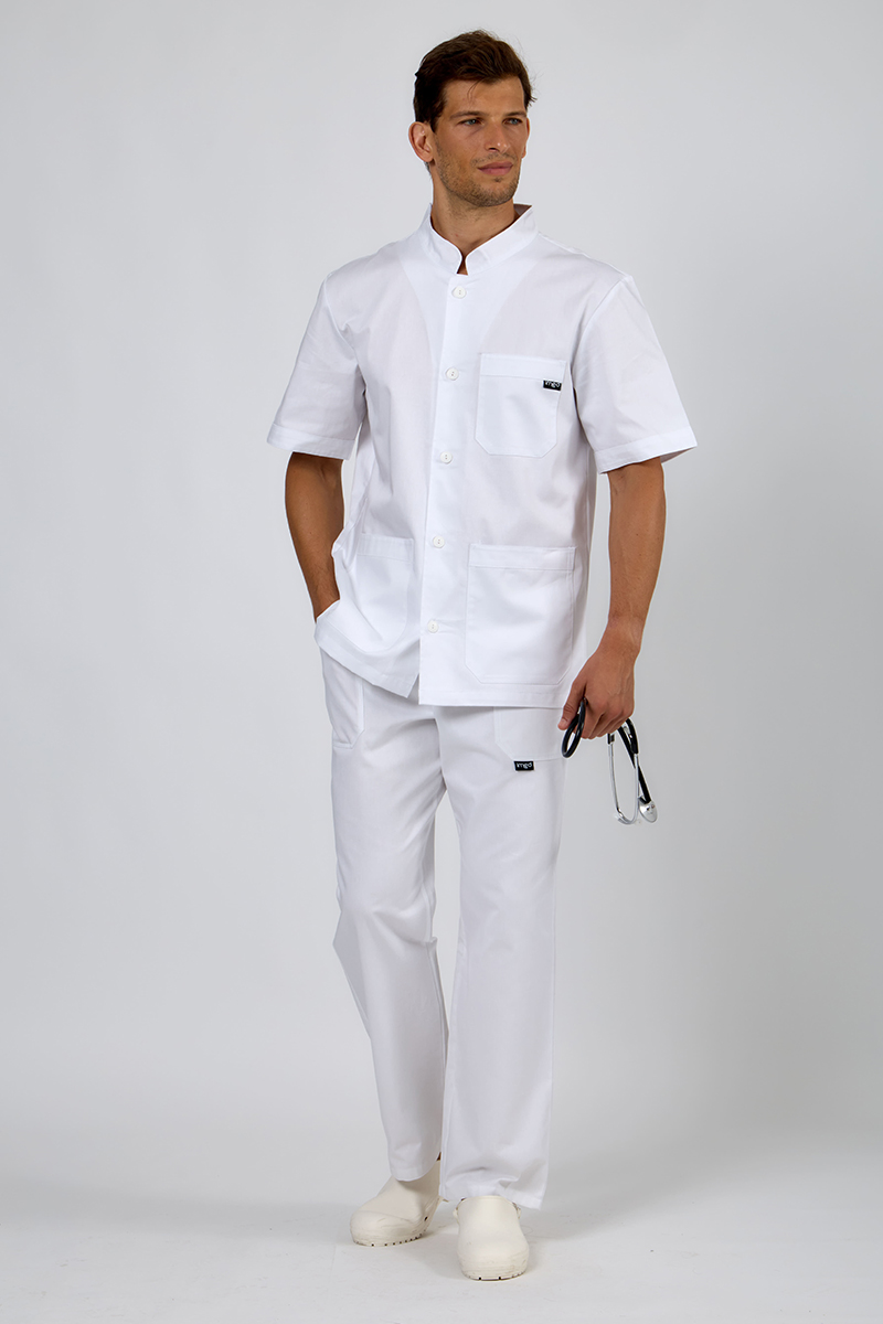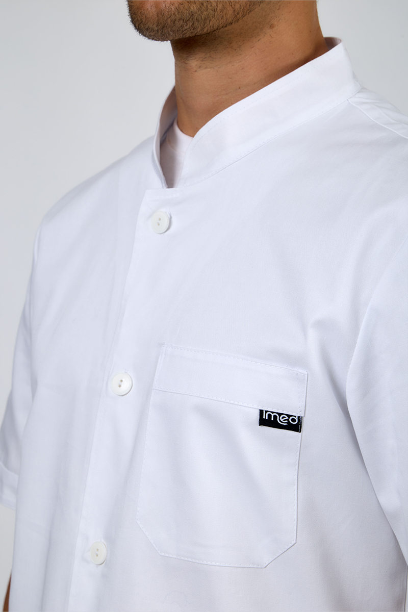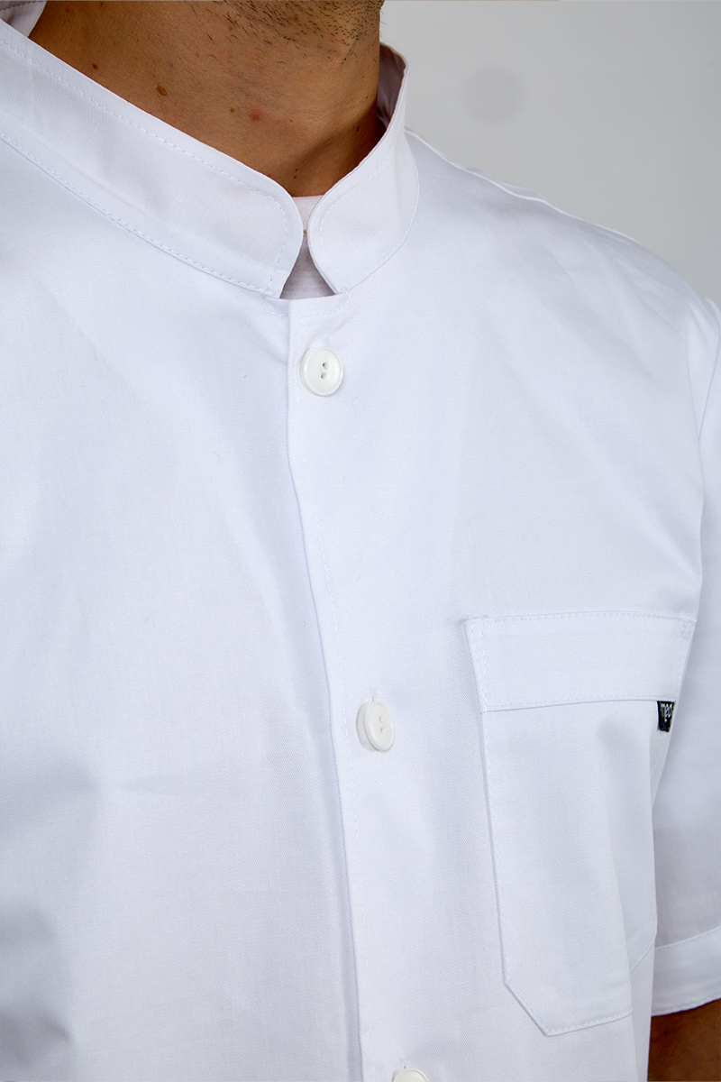 Giacca uomo con collo alla coreana con bottoni sul davanti e manica a giro, realizzata in 100% cotone, nel colore bianco con 2 tasche laterali e taschino.