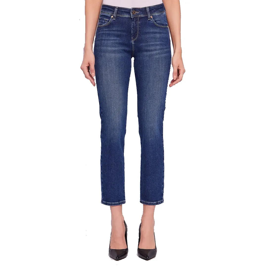 Jeans donna skinny cotone elasticizzato effetto used con salpa logata.