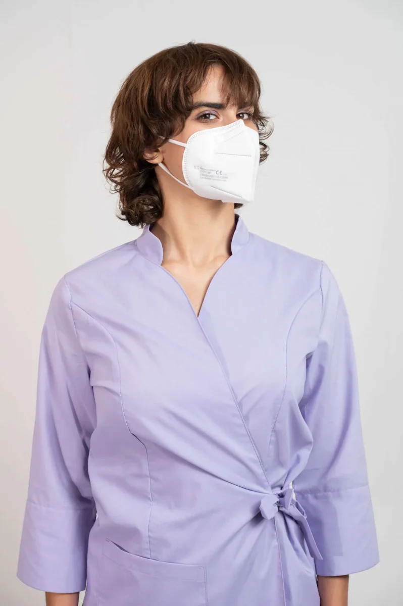 - Composizione – Tessuto non tessuto 35,7%, tessuto meltblown 22,8%, 12% cotone ad aria calda in fibra ES, elastici auricolari 21,5%, ponte nasale 8%.