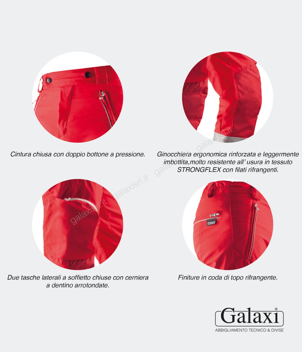 Il design ergonomico, unito alla vestibilità slim fit, agevola i movimenti, mentre le ginocchiere rinforzate e leggermente imbottite in tessuto STRONGFLEX con filati rifrangenti offrono resistenza extra nei punti di maggior usura. Le bande rifrangenti elasticizzate in microsfera sono omologate UNI EN ISO 20471:2017 per una visibilità superiore.