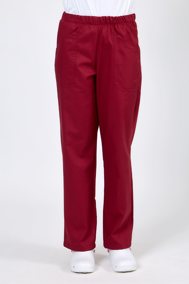 Pantaloni sanitari unisex realizzati in 100% cotone traspirante sono pensati per offrire il massimo comfort durante le lunghe ore di lavoro. Con due tasche applicate sul davanti sono ideali per infermieri, medici, operatori sanitari e professionisti del benessere. Realizzati nel colore bordeaux.