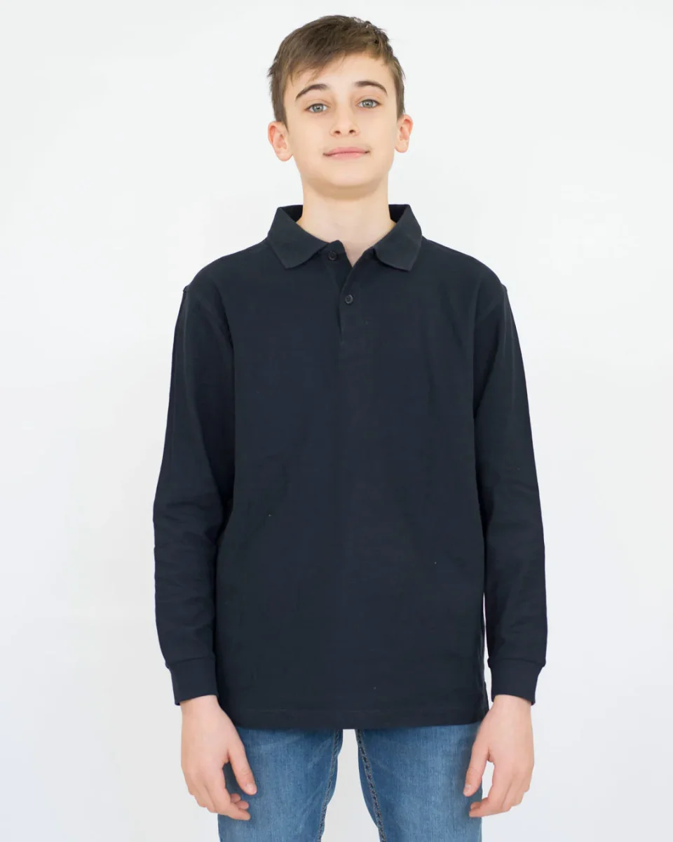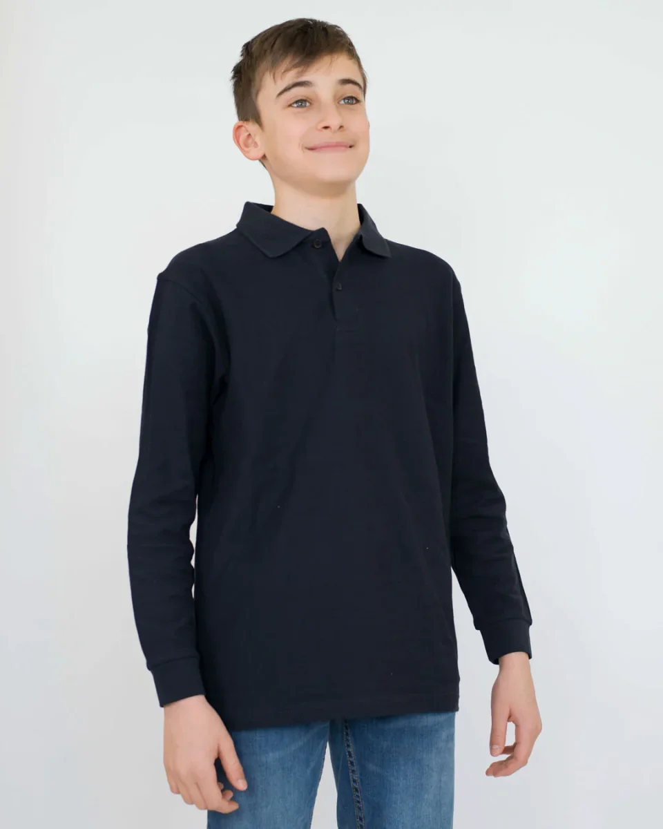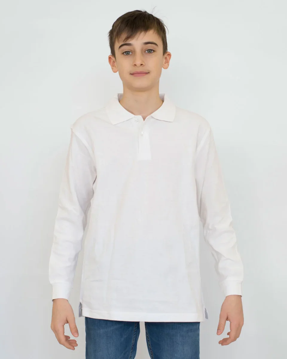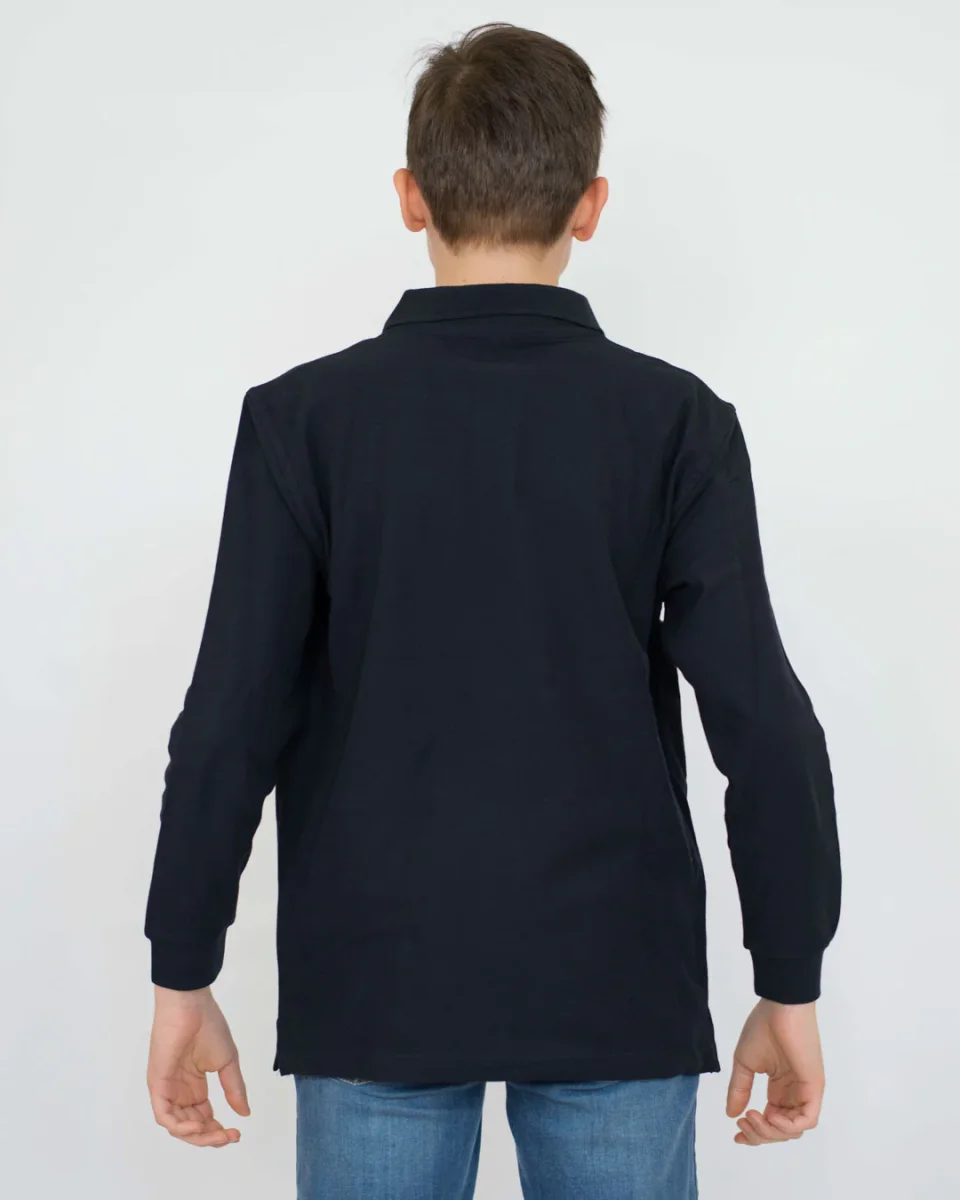 Polo a maniche lunghe da bambino 100% cotone piqué, set-in con costine, 2 bottoni tono su tono, nastro di rinforzo al collo, struttura con cuciture e spacchetti laterali.