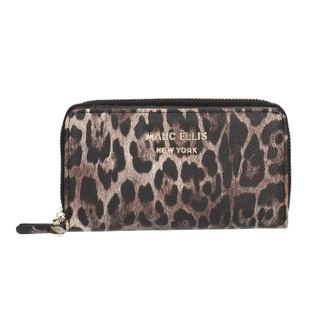 Portafoglio Marc Ellis da donna in ecopelle maculata con rifiniture dorate, scomparto anteriore con bottone e tasche per carte e banconote e scomparto posteriore con zip e all’interno un’ulteriore zip per le monete.