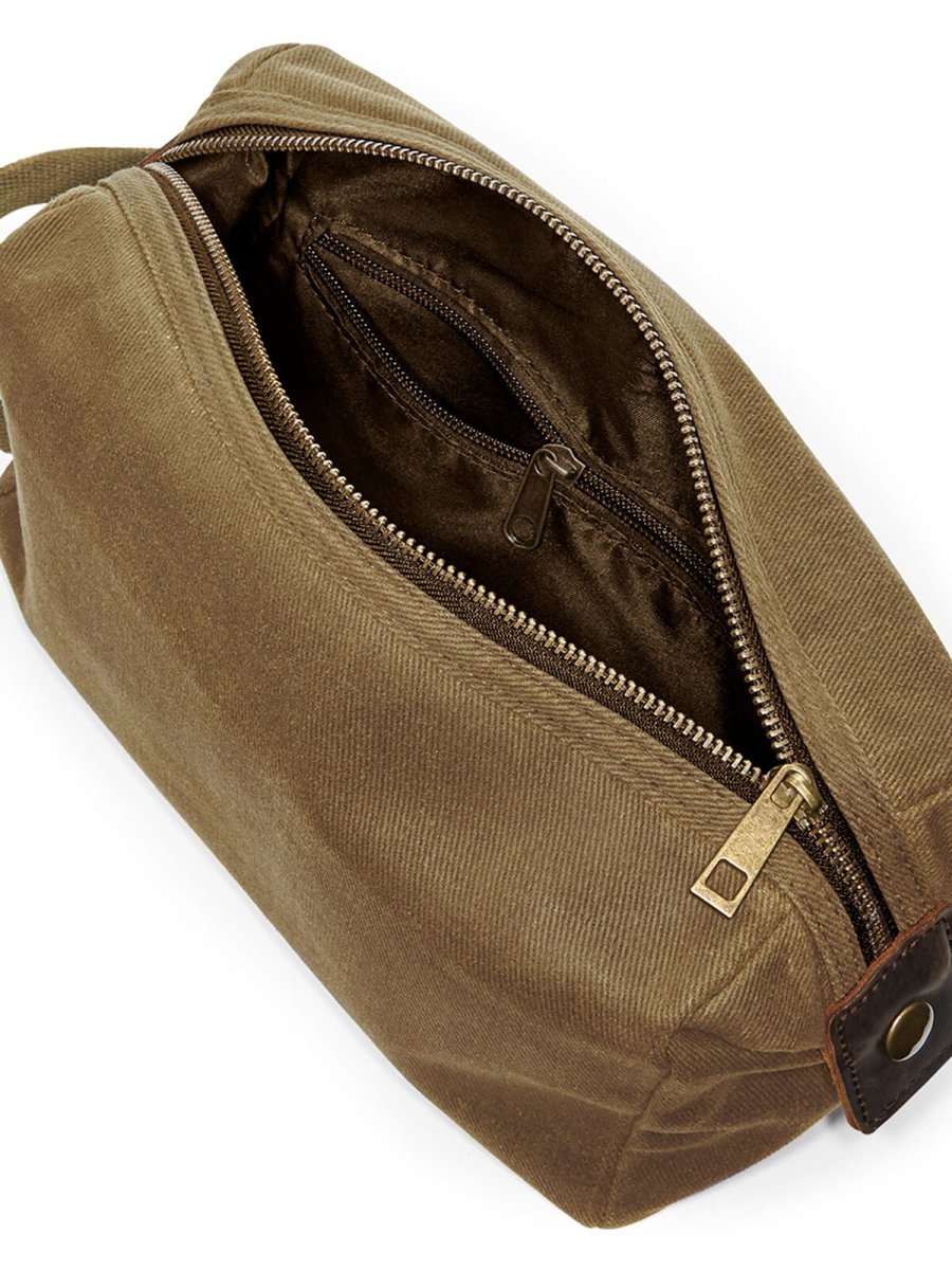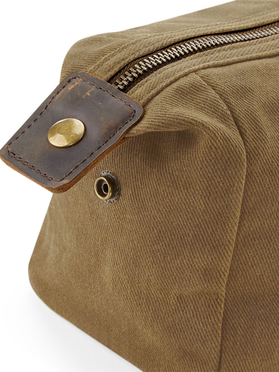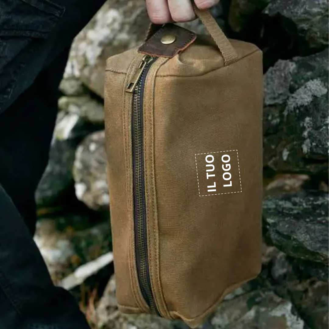 100% cotone canvas cerato resistente all’acqua. Beauty case con dettagli in vera pelle, scomparto principale e tasca interna con chiusura a zip, manico in fibra di cotone, rifiniture effetto ottone antico. Dimensioni: 12x25x11 cm, capacità: 4 litri, area di stampa: 18×10 cm.