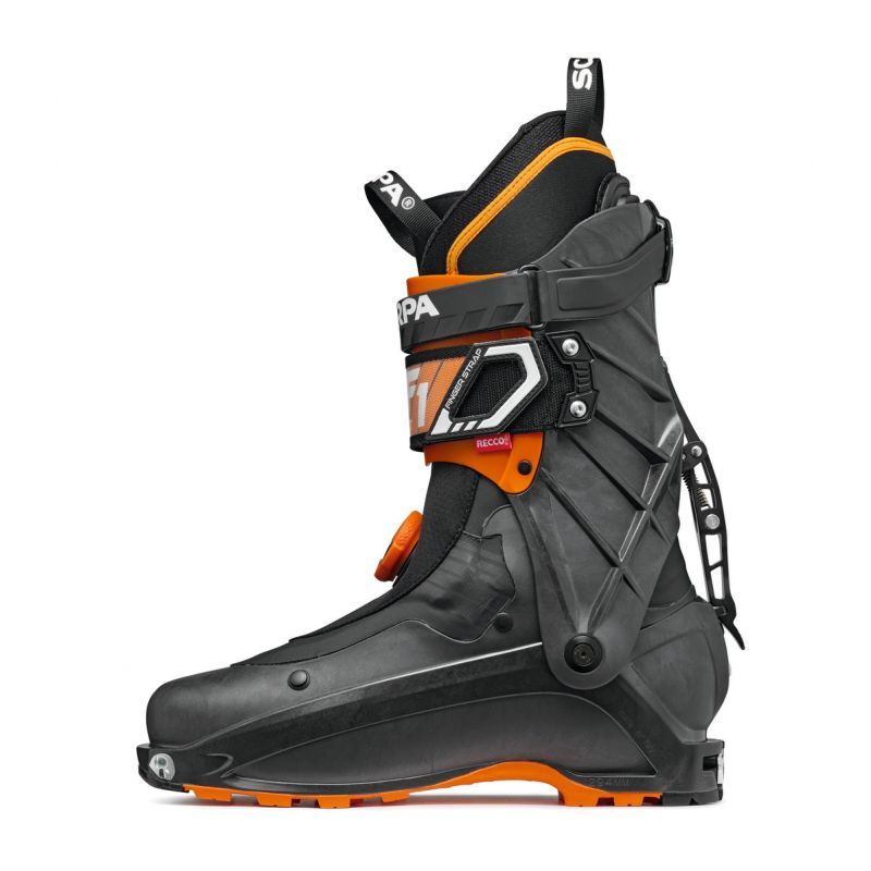 Uno degli elementi distintivi dello Scarpa F1 LT è il sistema di chiusura BOA® integrato nella parte inferiore dello scafo, che consente una regolazione micrometrica rapida e uniforme. Il power strap superiore completa la calzata, garantendo sostegno e precisione in fase di discesa. Il meccanismo ski/walk è semplice, affidabile e progettato per transizioni veloci, caratteristica fondamentale nelle uscite dinamiche e nelle competizioni light.