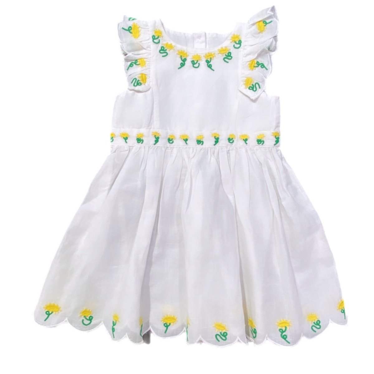 Abito manica corta con rouche-cotone/lino/girasoli ricamati