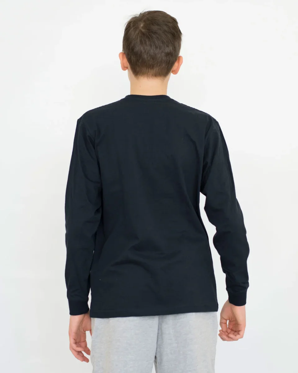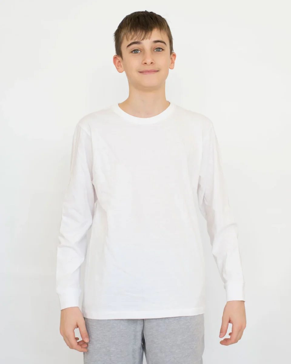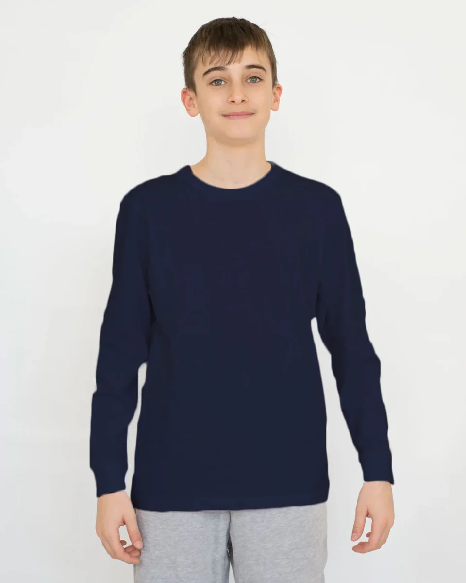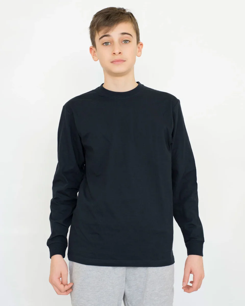 Maglia bambino collo tondo e manica lunga 100% cotone.
