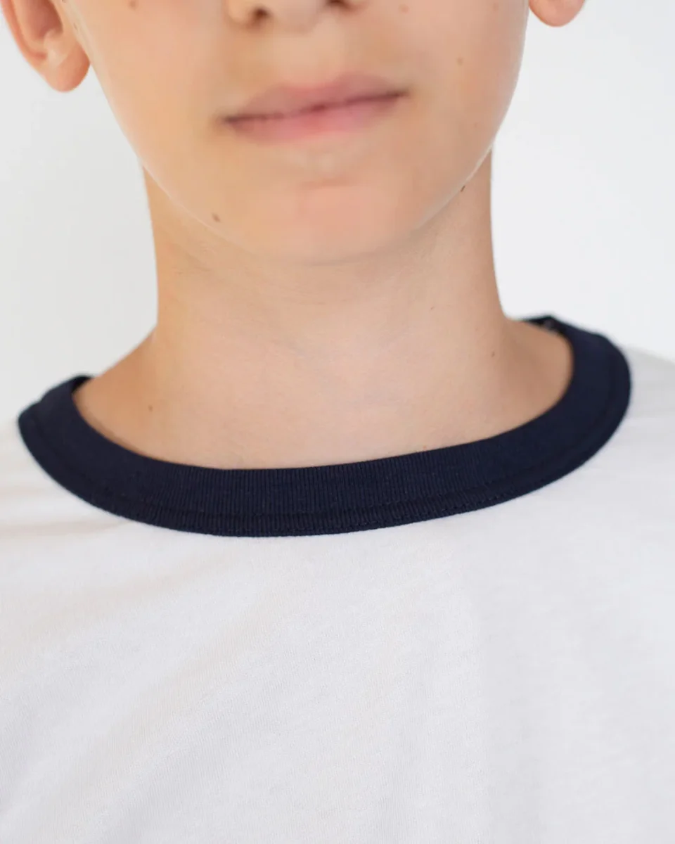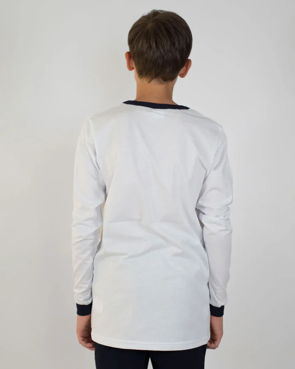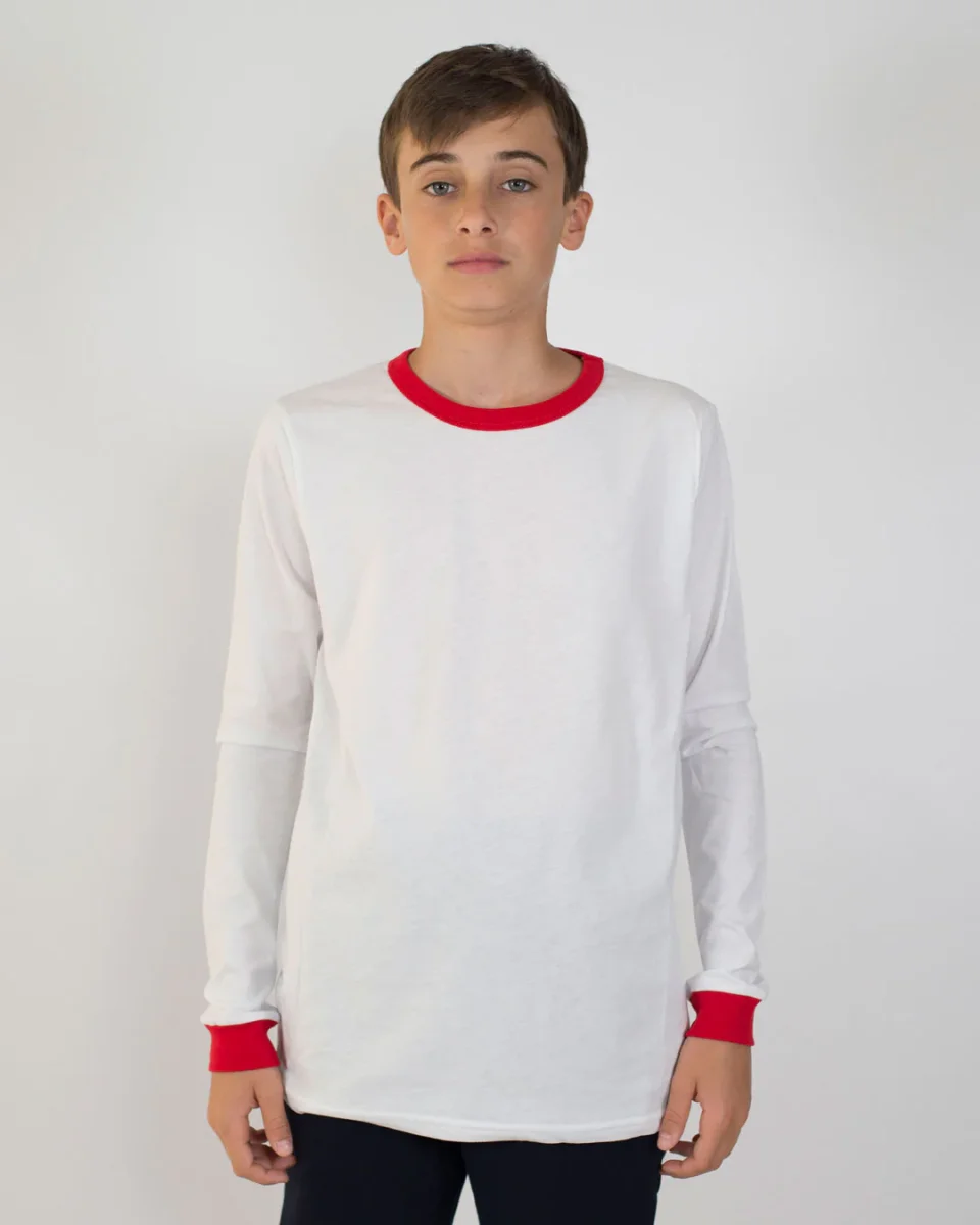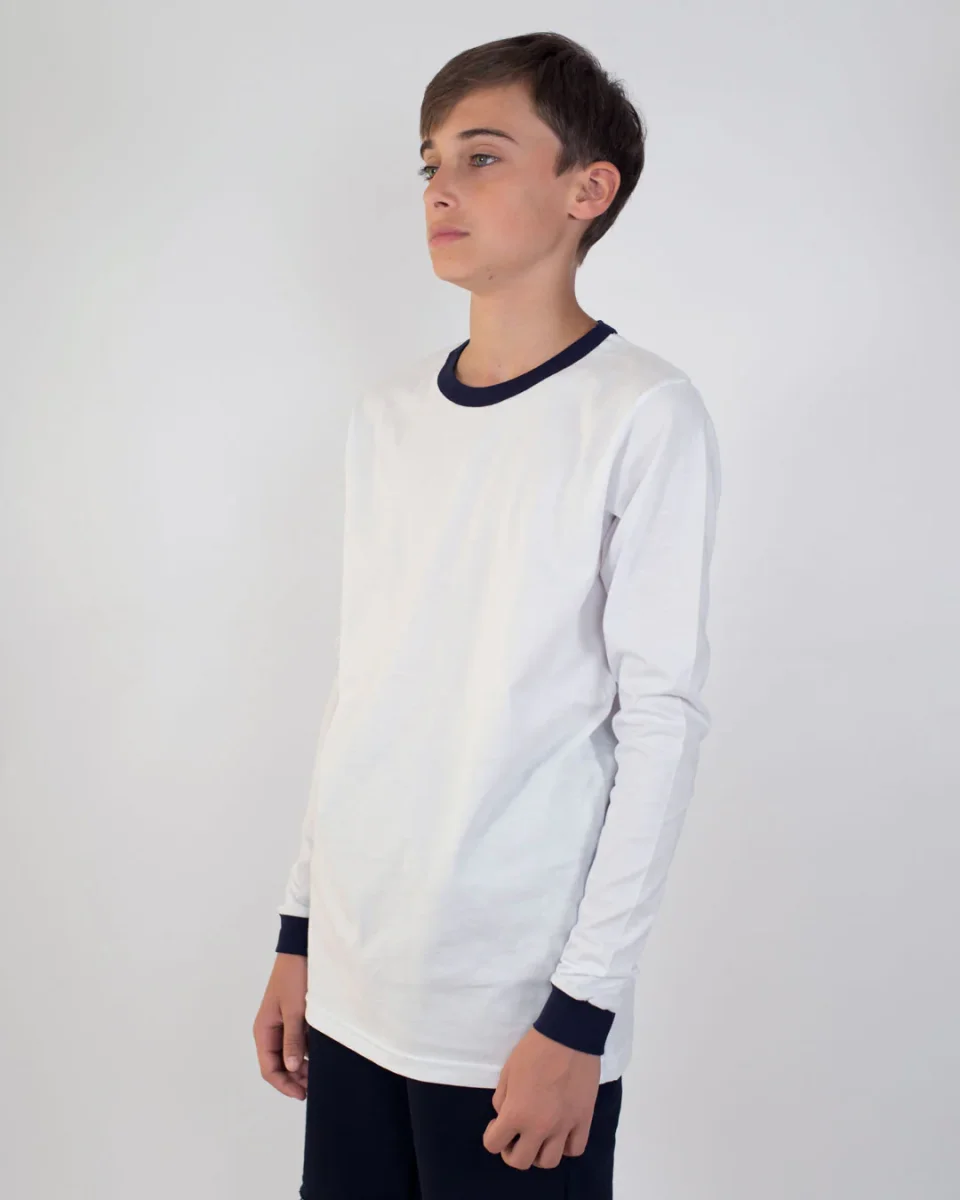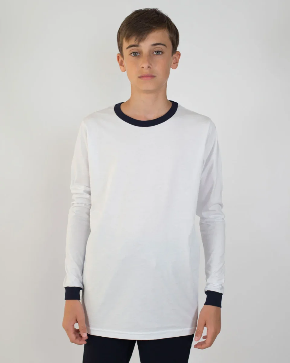 Maglia bambino manica lunga 100% cotone 140 gr. Bicolore in contrasto al collo e bordo manica. Prodotto Made in Italy.