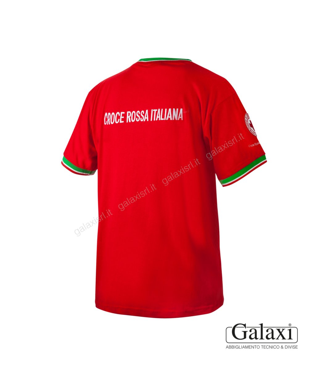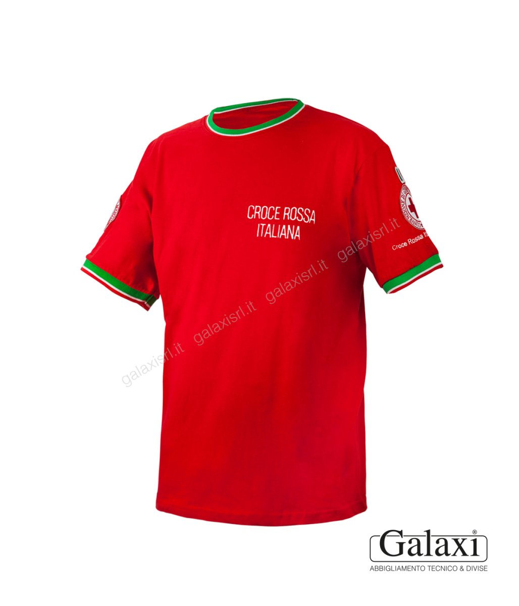Vestibilita’: regolare. Tintura colore rosso reattiva. Rosso Pantone 18-1655 T-SHIRT Operativa manica corta, modello unisex, maniche e collo tricolore. Confezionata con tessuto 100% Cotone preristretto ritorto ad anelli, gr 185 m2 A norma CE EN ISO 13688:2022 COMPLETO DI RICAMI E STEMMI: CROCE ROSSA ITALIANA