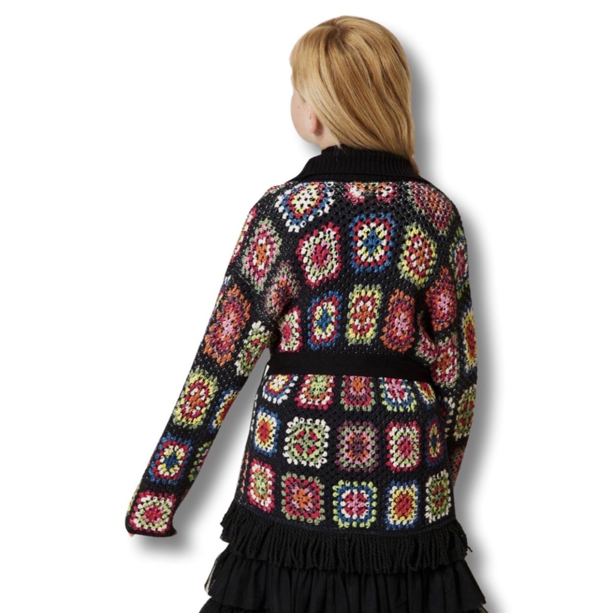 100%cotone-cardigan con cintura rimovibile-fondo rifinito da frange-collo sciallato a costine-cardigan lavorato a punto traforato