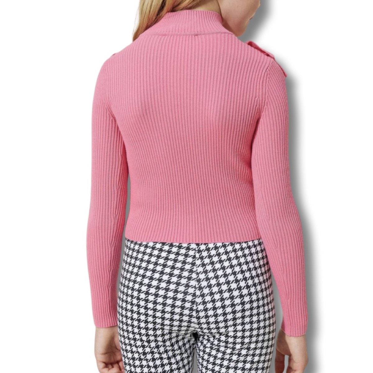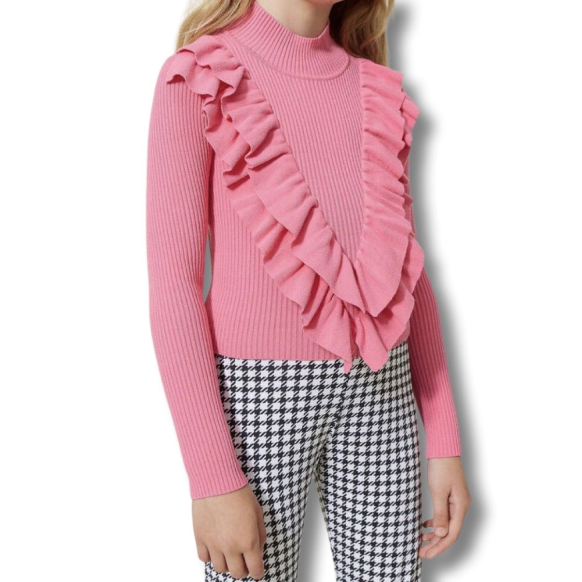 62%viscosa 38%po-maglia lupetto a costine con collo alto-doppia balza arricciata a V davanti-maniche lunghe