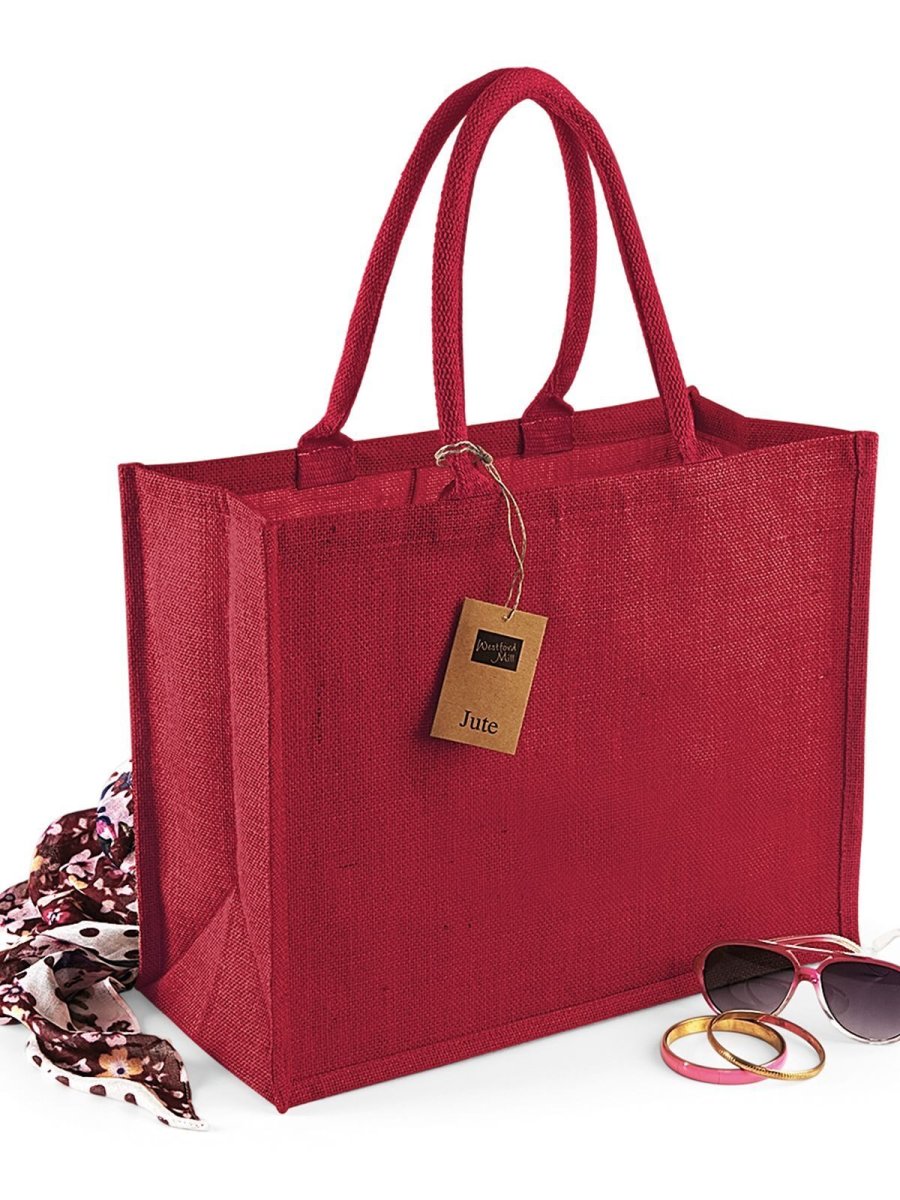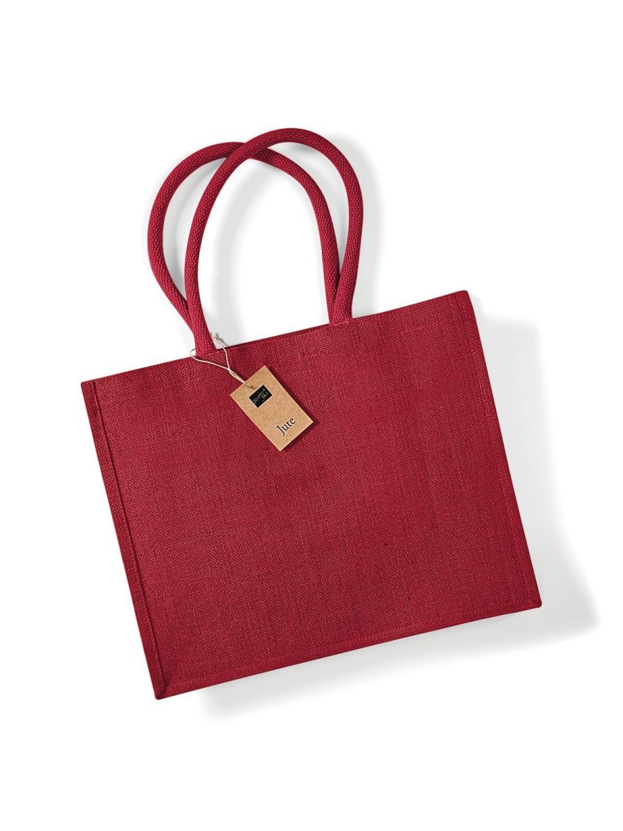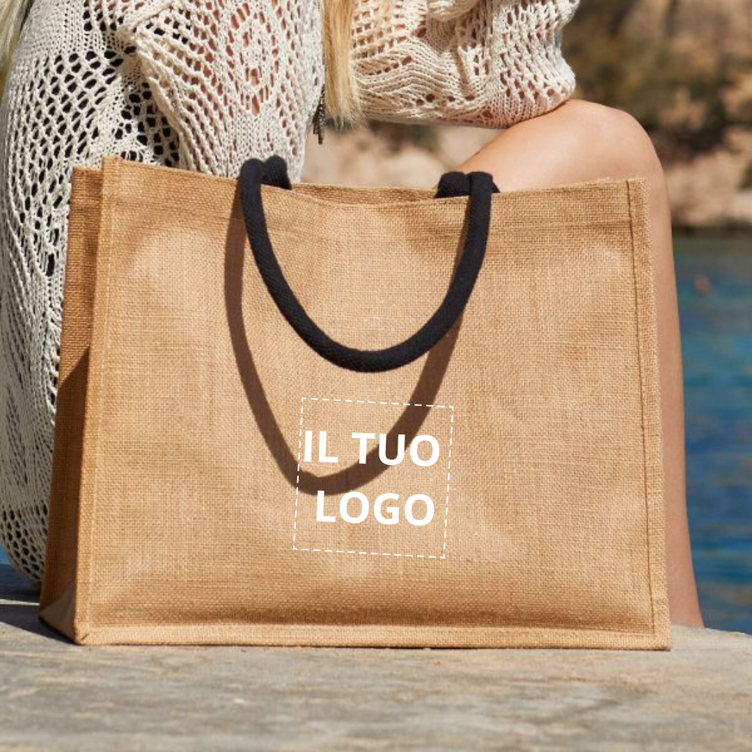 100% Juta laminata. Shopper multiuso. Etichetta removibile. Lunghezza manico: 55 cm, dimensioni: 33 x 42 x 19 cm, capacita’: 21 litri, area stampabile: 34 x 24 cm.